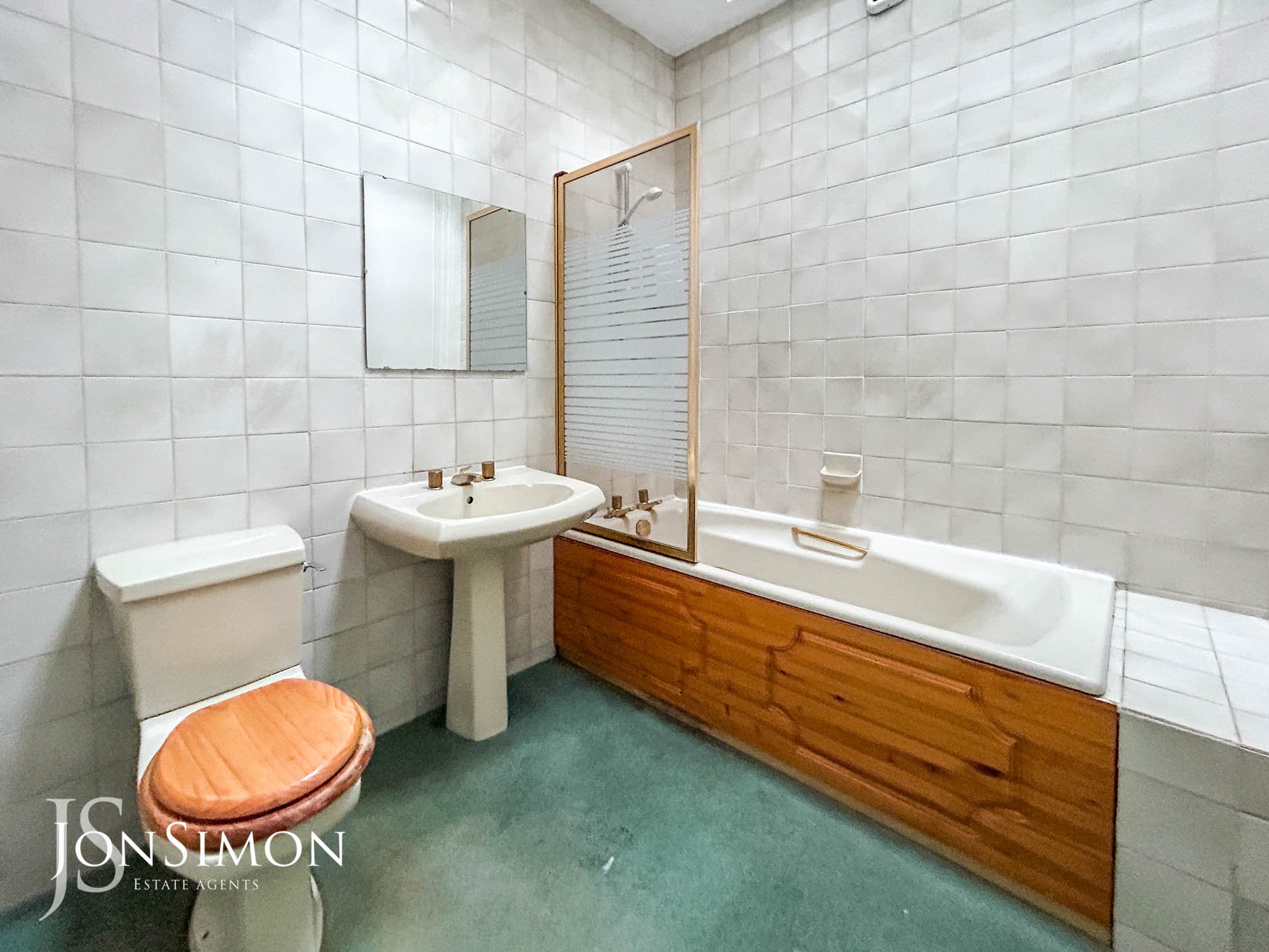Three piece bathroom suite comprising of a panel bath with mixer taps, electric shower above, shower screen, low-level WC, wash hand basin, radiator, storage cupboard, extractor unit, ceiling spotlights and Velux window.