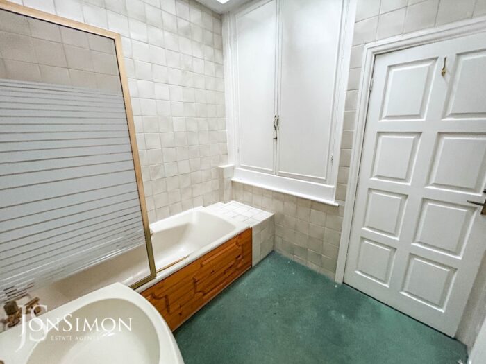 Three piece bathroom suite comprising of a panel bath with mixer taps, electric shower above, shower screen, low-level WC, wash hand basin, radiator, storage cupboard, extractor unit, ceiling spotlights and Velux window.