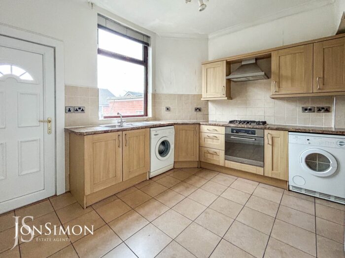 A range of wall and base units with complementary worksurface, four ring gas hob with extractor unit above, electric oven, plumbed for washing machine and dryer, radiator, part tiled walls, storage cupboard under the stairs, one and a half bowl sink unit with drainer, tiled flooring, combi boiler, ceiling covering, ceiling point, UPVC double glazed rear window and back door.