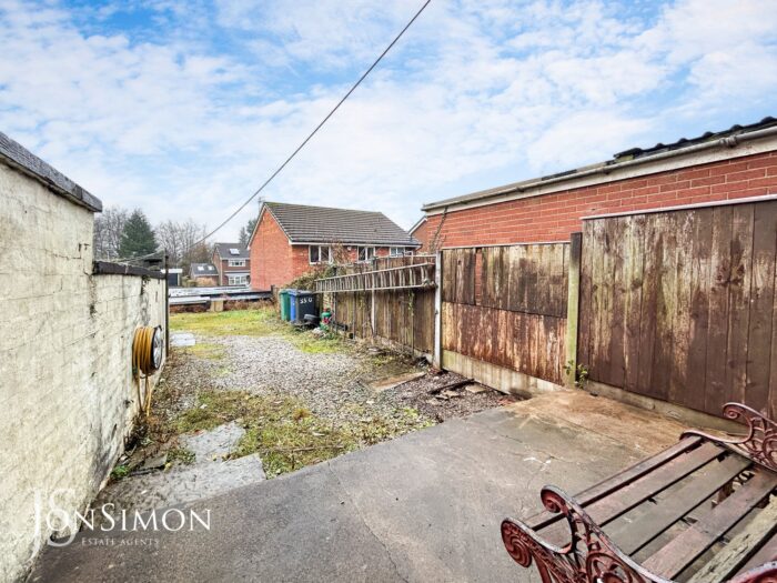 A concrete paved to patio area, pebble driveway for off-road parking.
