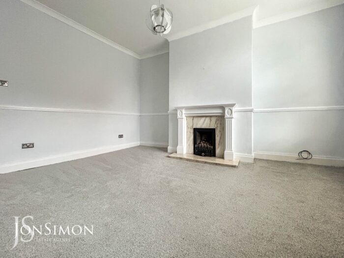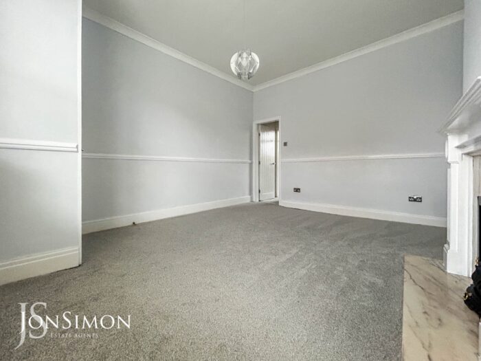 UPVC double glazed front window, coal effect gas fire with surround, radiator, meter cupboard, ceiling coving and ceiling point.