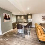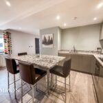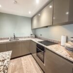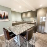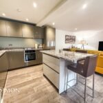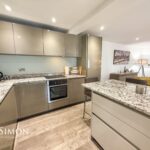 A contemporary range of wall and base units with complementary granite works surface, four ring induction hob with extractor above, integrated electric oven, fridge, freezer, dishwasher and washing machine, breakfast bar, single bowl sink with drainer, laminate flooring, ceiling spotlights, Elkatherm electric radiator and UPVC double glazed window.