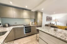 A contemporary range of wall and base units with complementary granite works surface, four ring induction hob with extractor above, integrated electric oven, fridge, freezer, dishwasher and washing machine, breakfast bar, single bowl sink with drainer, laminate flooring, ceiling spotlights, Elkatherm electric radiator, under floor heating and UPVC double glazed window.