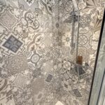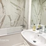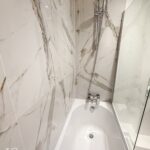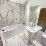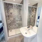 A contemporary designer three-piece white suite comprising of a large walk-in shower unit, low level WC, wash hand basin, chrome towel radiator, tiled flooring, part tiled walls and ceiling spotlights.