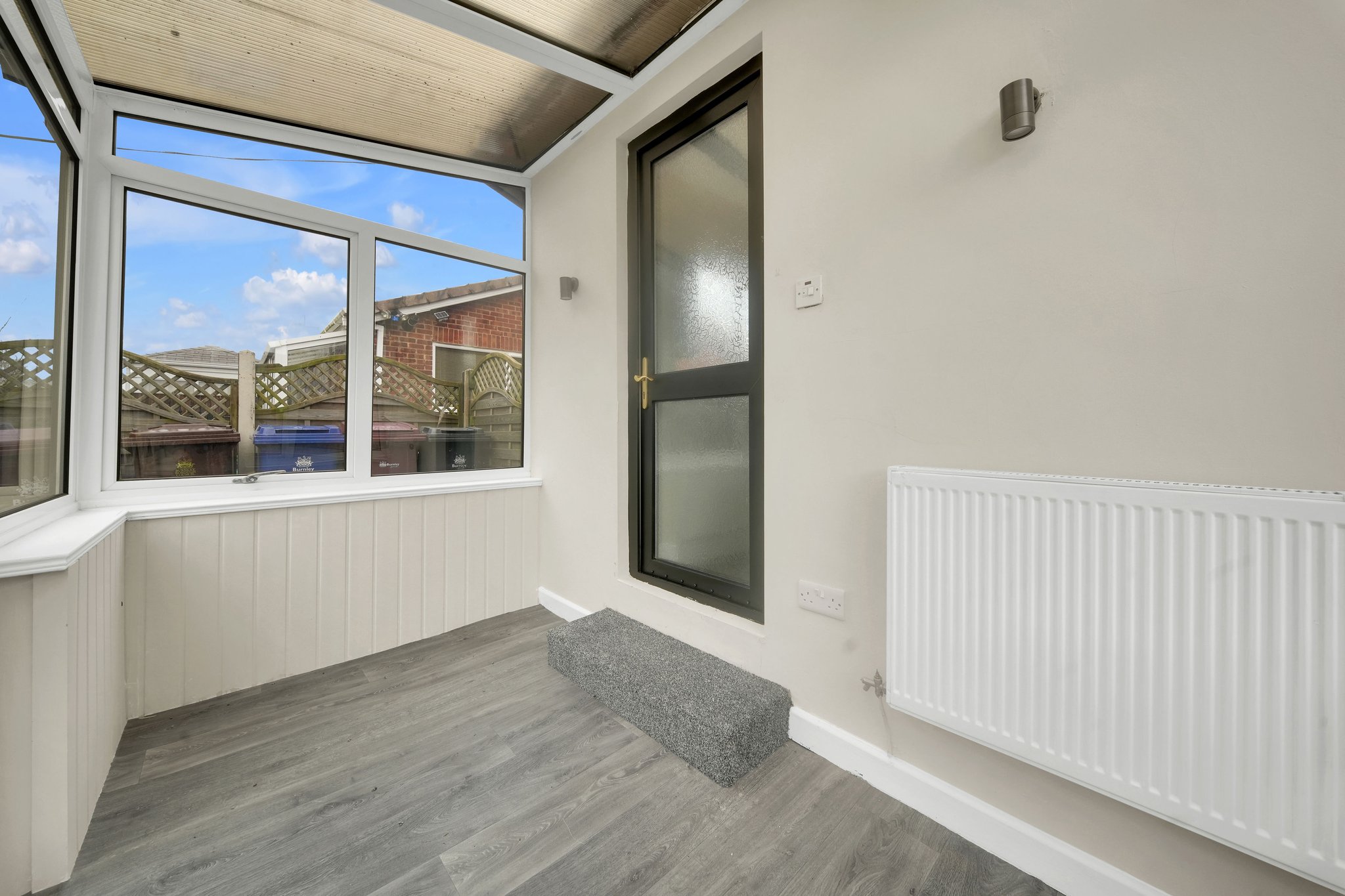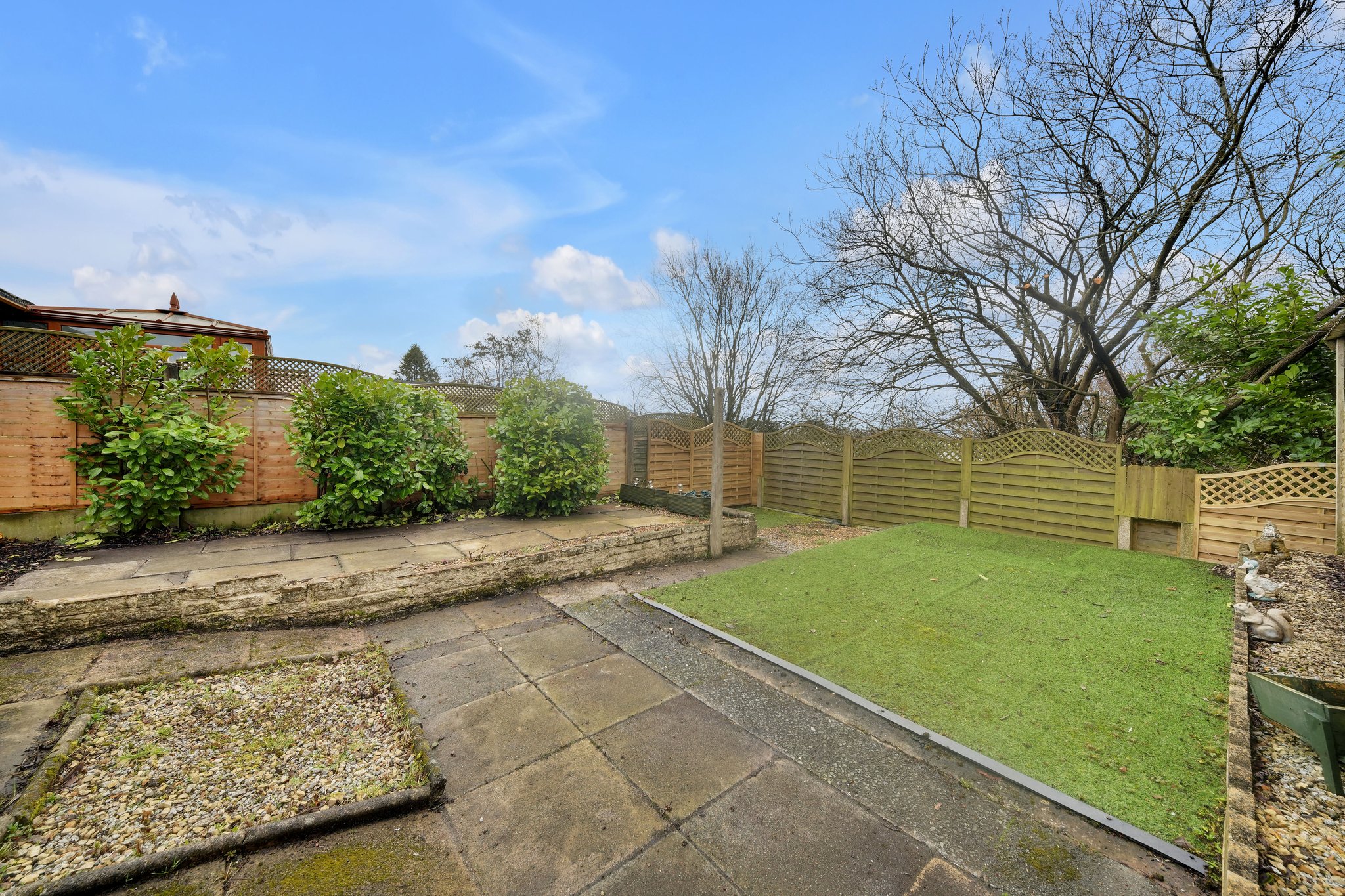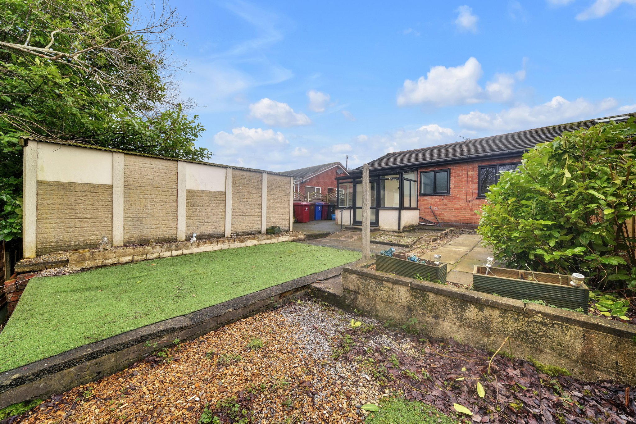 Being paved for ease of maintenance and having artificial turf. Enclosed panel fencing.