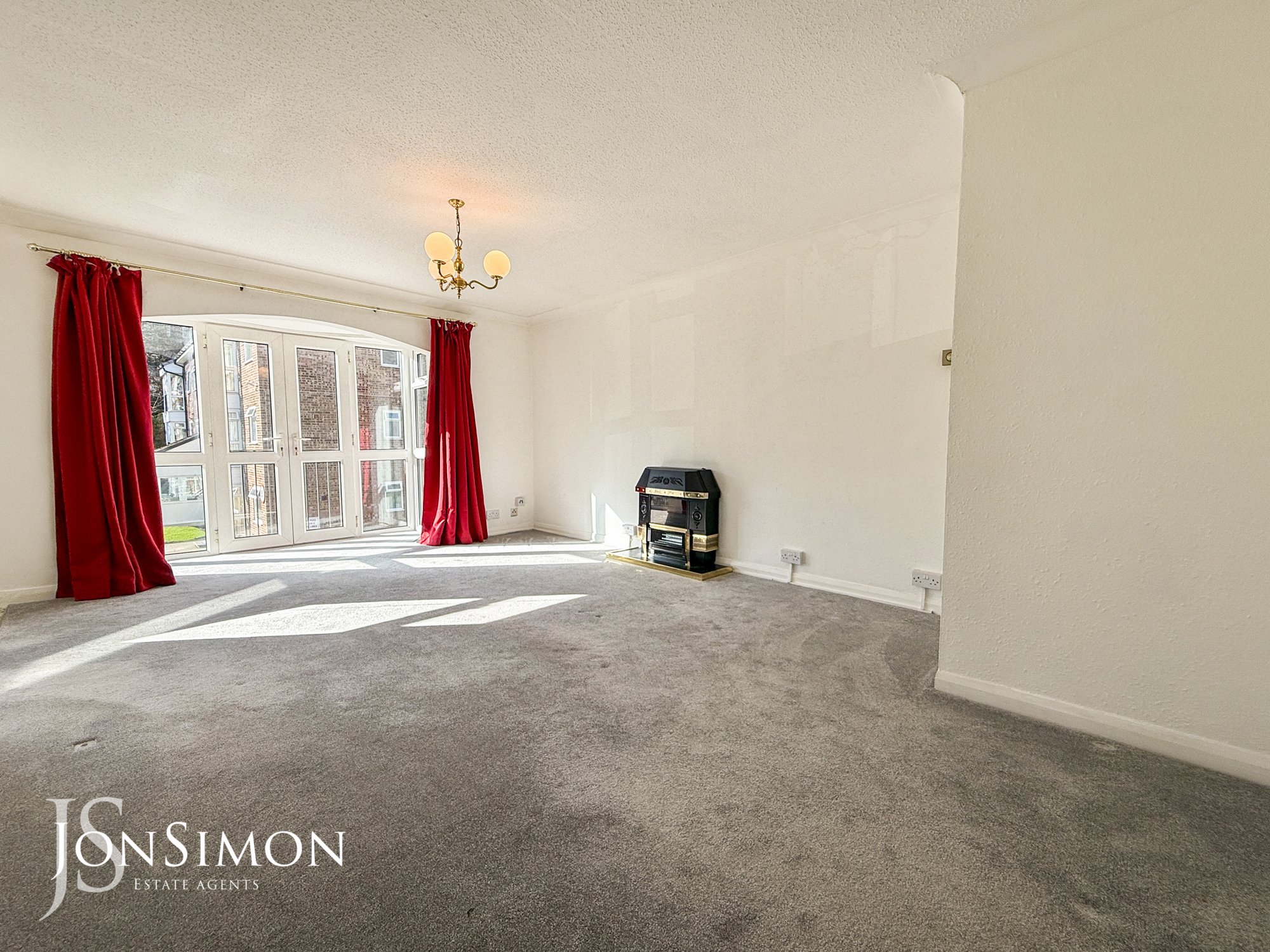 Carpet flooring, large bay window and double doors providing access to the Juliette balcony, electric heater.