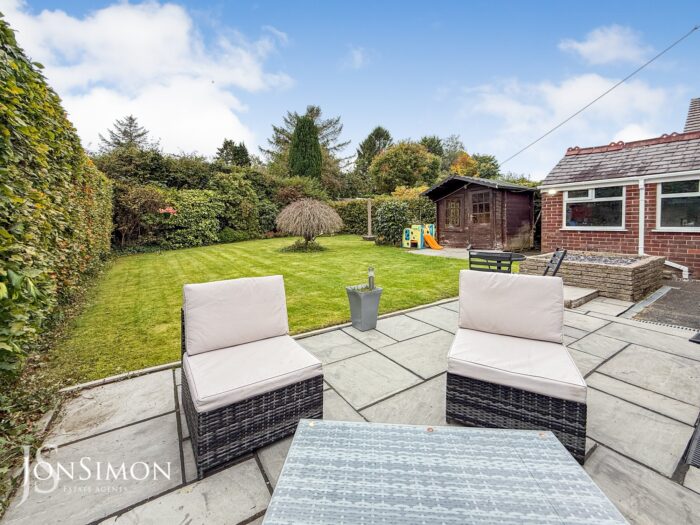 Rear: A large paved patio area, large lawn area, well established borders and shrubs, wooden summer house, external lighting and gated access to the side.