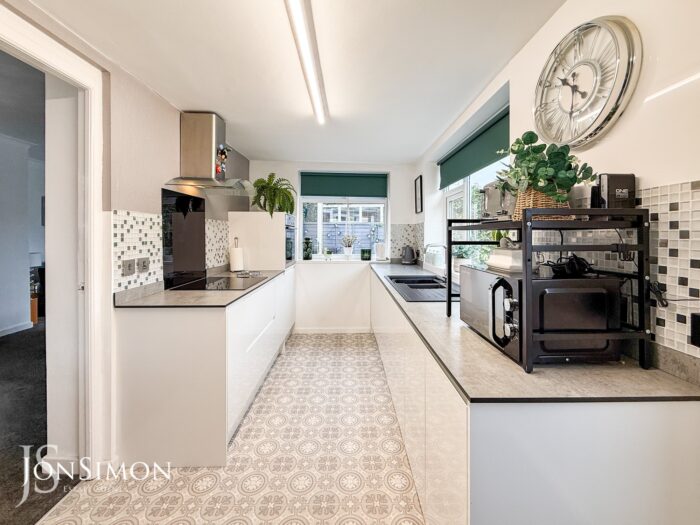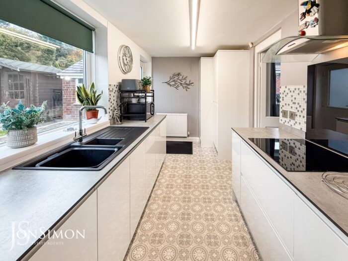 A modern contemporary kitchen with a range of wall base units, complementary work surfaces, 1 1/2 bowl sink unit with drainer, four ring induction hob with extractor above, integrated electric oven, fridge, freezer, dishwasher and washing machine, part tiled walls, radiator, ceiling point, UPVC double glazed side and rear windows. Composite double glazed back door.