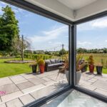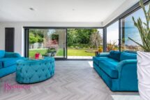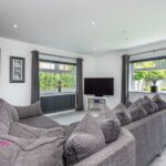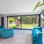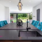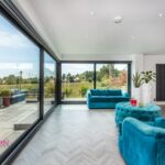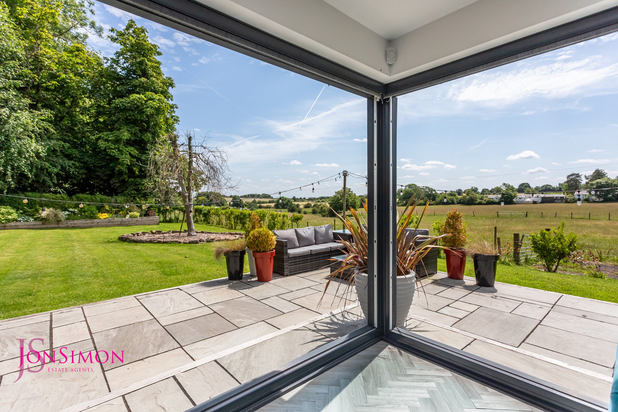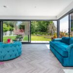This contemporary open-plan space features a generous L-shaped layout, showcasing modern design elements through expansive floor-to-ceiling sliding doors that grace three elevations. These doors effortlessly connect the interior to the rear garden, blurring the lines between indoor and outdoor living and enhancing the stunning countryside views.