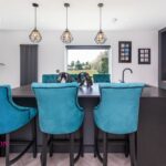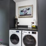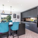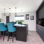 At the heart of this culinary haven lies a show-stopping island unit, perfect for entertaining. This centrepiece comfortably seats six and is topped with a striking ‘Dekton-Laurent’ stone waterfall worktop in dark grey and copper tones, beautifully accentuated by a trio of pendant lights. The island extends to create a multifunctional space for culinary creations and casual meals alike.