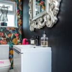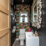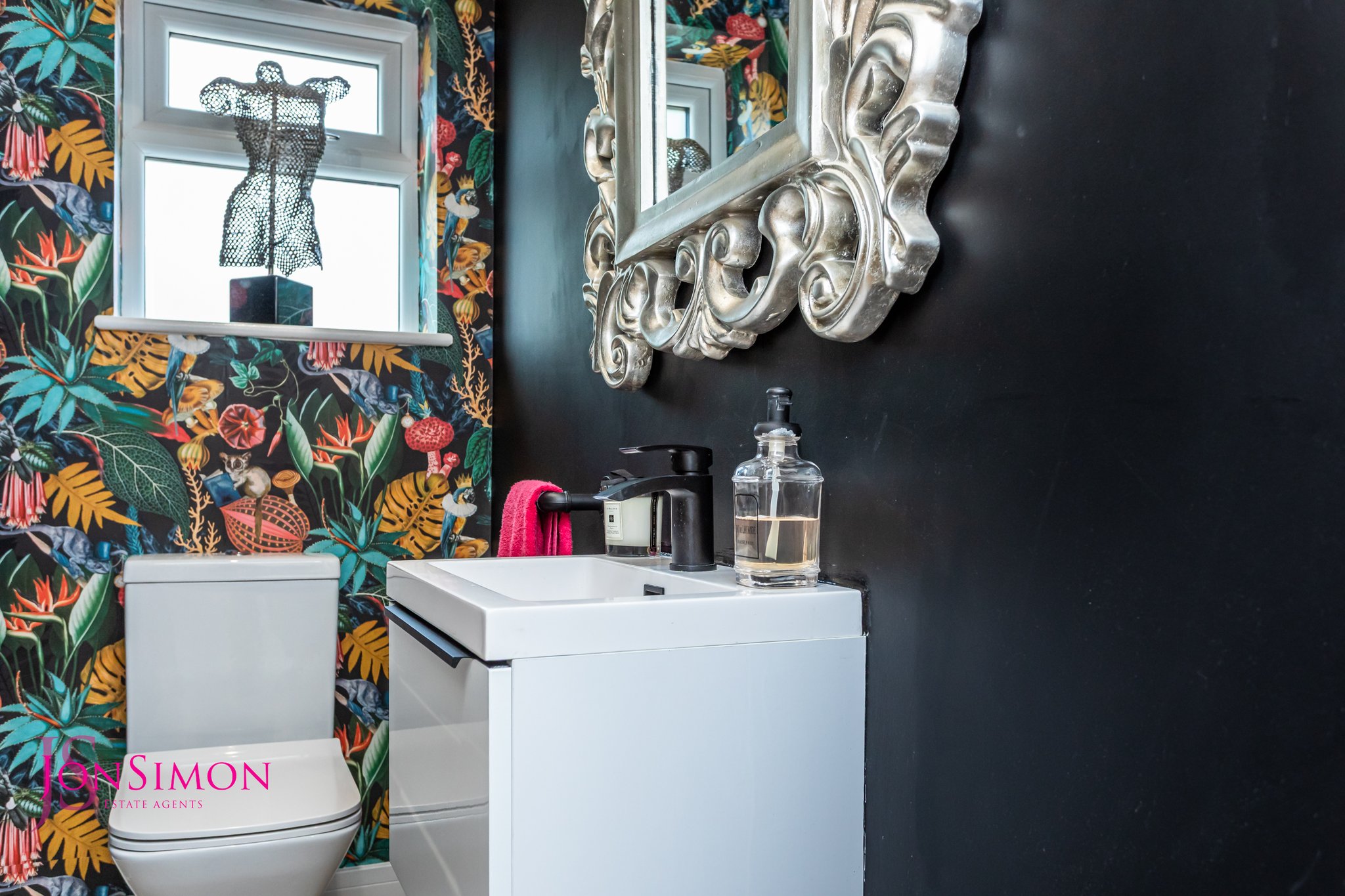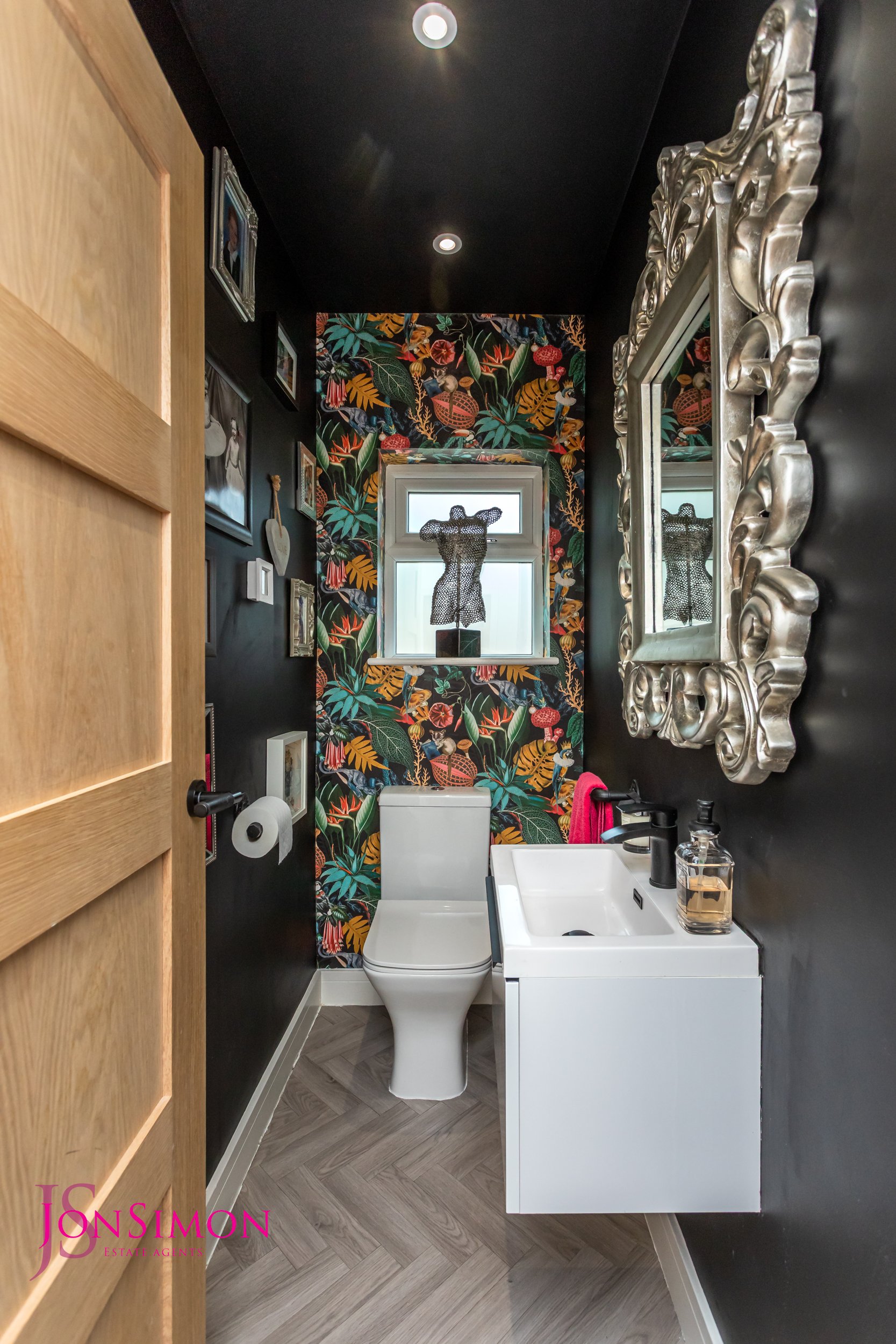Stylish guest WC that beautifully marries practicality with design. Adorned with striking 'Forbidden Fruit' wallpaper in rich sage green and gold, this space exudes elegance. The sleek white gloss vanity unit and WC stand out against the dramatic black walls, while the flooring continues from the hallway, ensuring a cohesive look throughout.