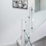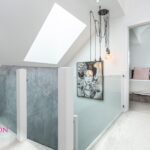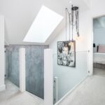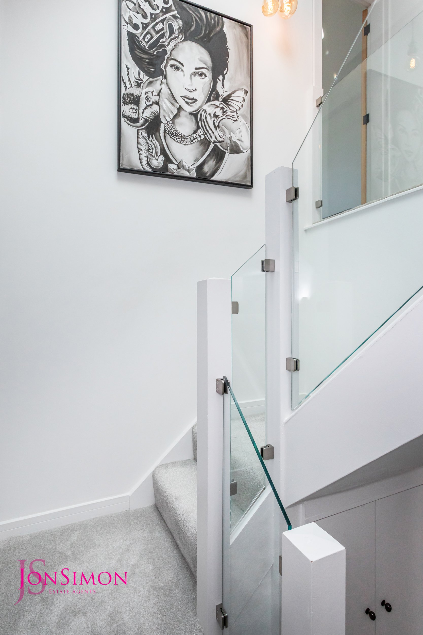 Bespoke glass balustrade staircase to the first floor, a large sky lantern above the stairwell enhances the sense of space, flooding the area with natural light.
