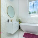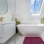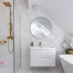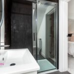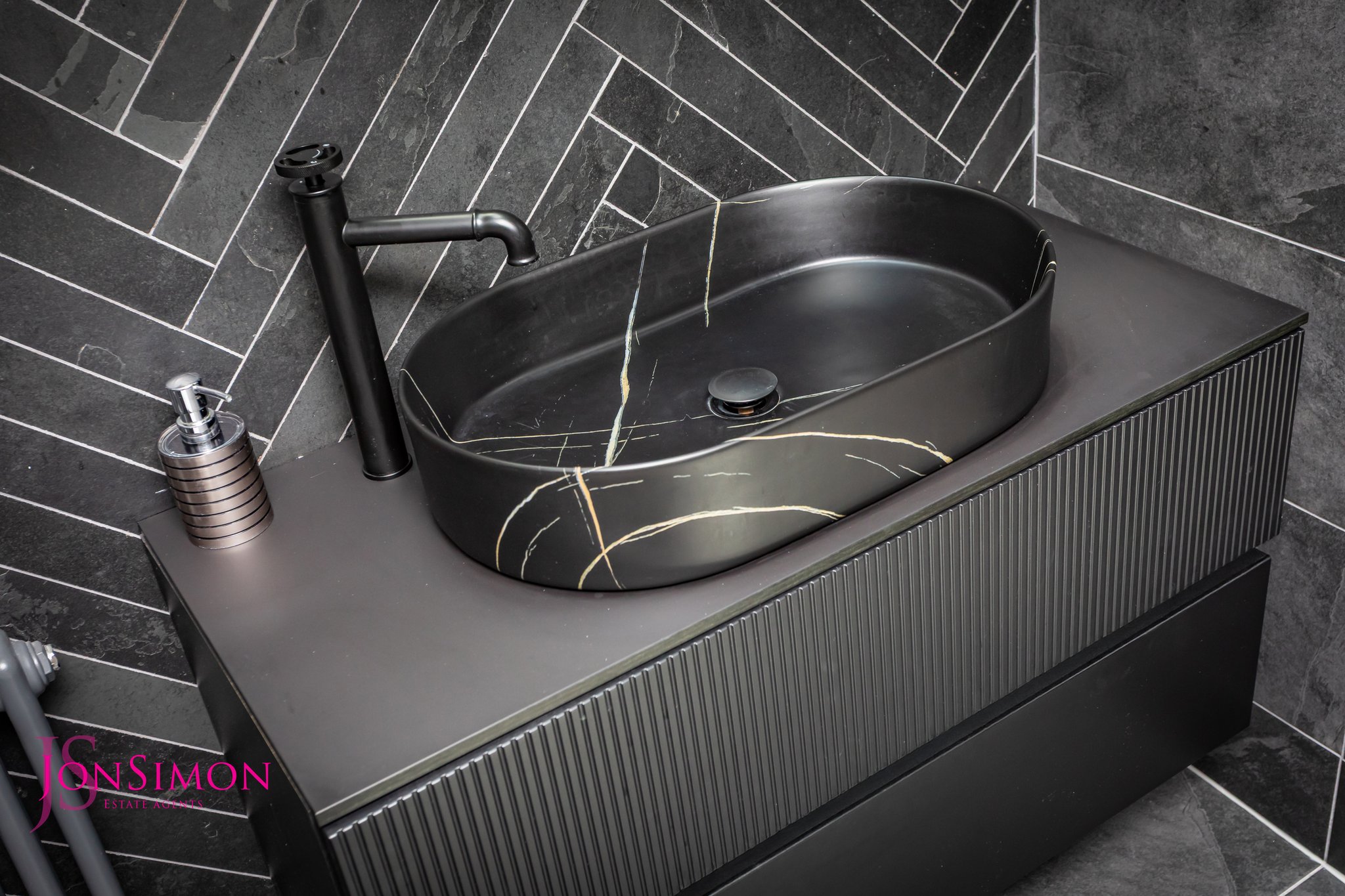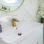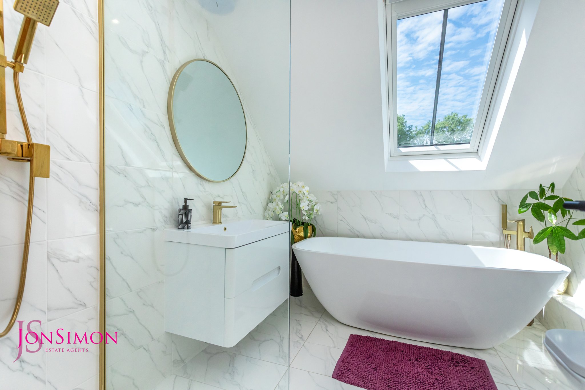 The family bathroom is an opulent haven. It features a freestanding bath and a walk-in shower with premium fixtures and a glazed screen. The wall-hung white gloss vanity sink, complete with a mirror above, is enhanced by sleek, contemporary gold fittings. Marble-effect tiling adorns the walls and floor, ensuring every detail has been meticulously considered to create a luxurious and comfortable escape for you and your family.