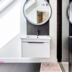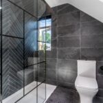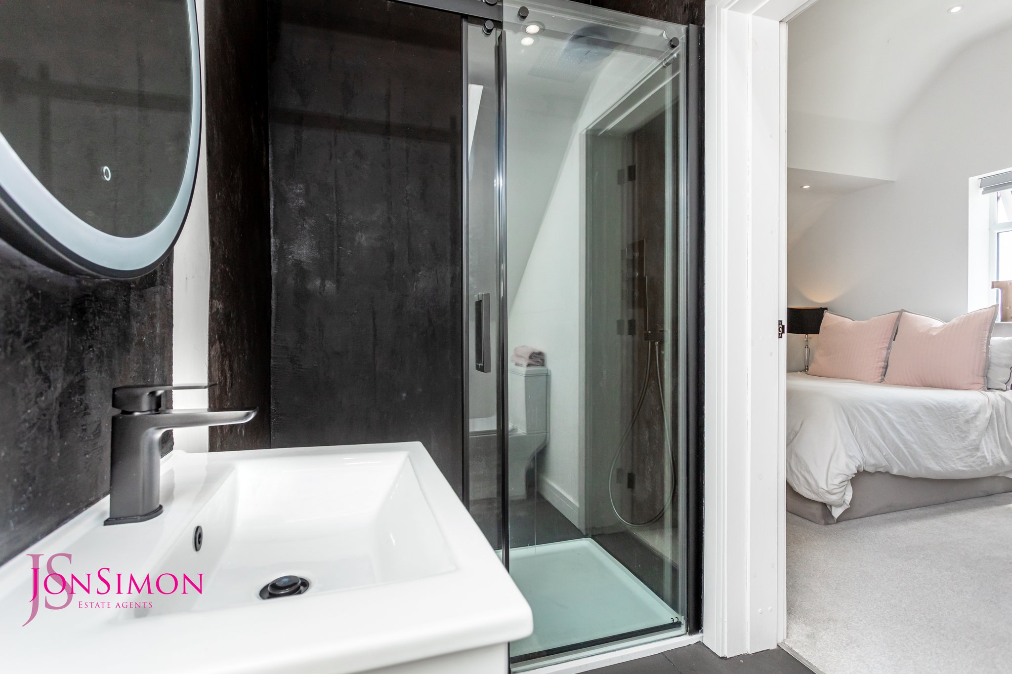 En-suite shower room is a stylish retreat, featuring a black-tiled floor, a matching strip behind the wall-hung vanity basin, a chic mirror, and a walk-in shower enclosed with glass and accented by sleek black sanitaryware.