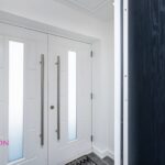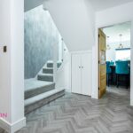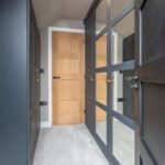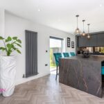 Ceiling spotlights that illuminate the space and herringbone-washed oak vinyl flooring that adds a touch of warmth. Quality oak four-panel doors line the interior, adorned with striking black ironmongery, while a stylish black wall-mounted column radiators add both function and flair.