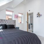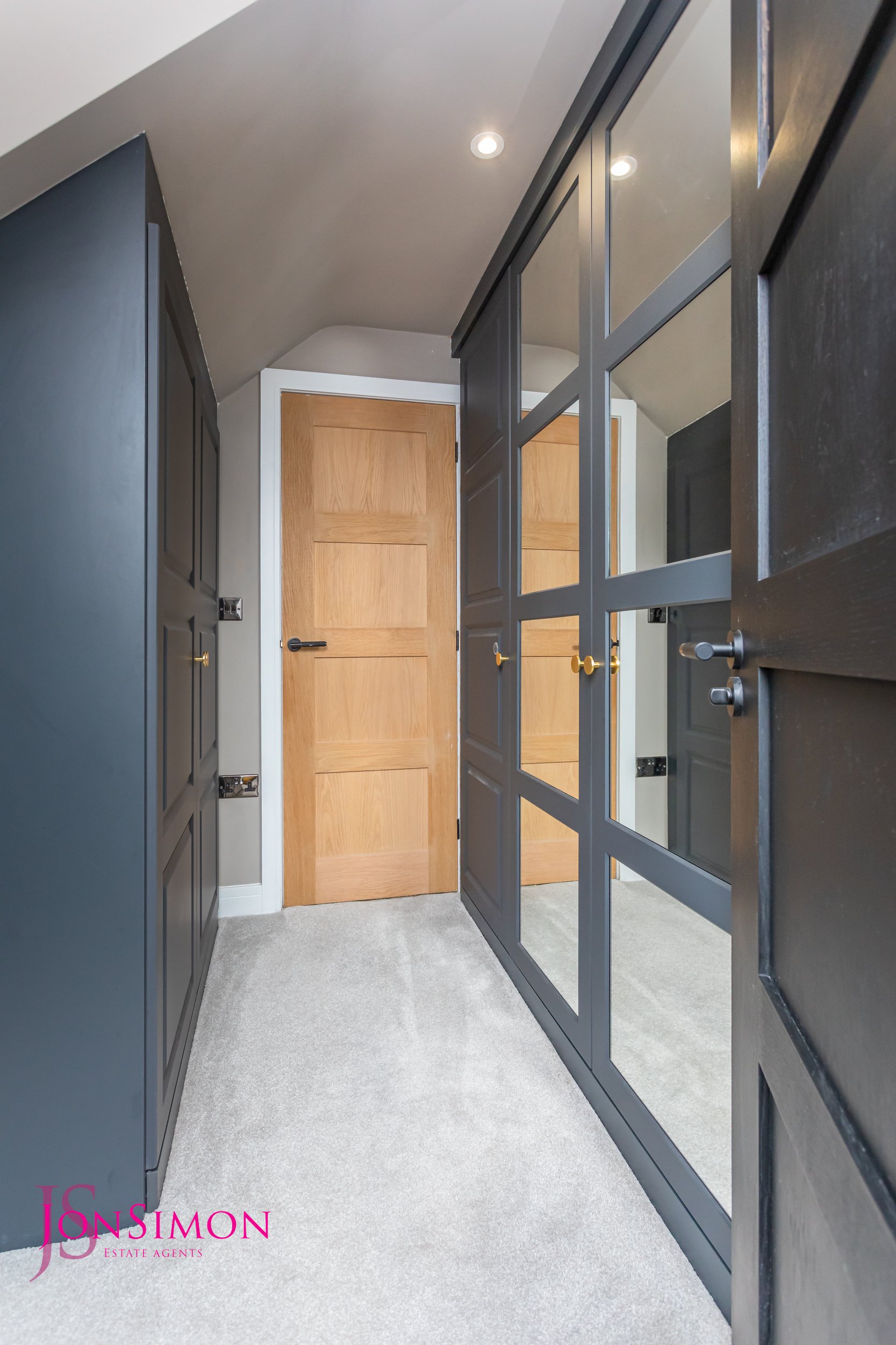 The fitted wardrobes in the dressing area, finished in sleek black with mirrored inserts, provide ample storage while adding a touch of elegance.