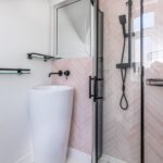 A modern Italian cone-shaped full pedestal basin, a shower with a glazed screen, and wall-mounted black taps, all enhanced by a pink chevron feature tile on one wall and an inset mirror above the sink.