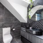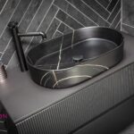 A large walk-in shower, elegantly enclosed by a black grid shower screen. A wall-hung charcoal fluted vanity unit is topped with a luxurious stone basin, perfectly paired with a backlit mirror above. The feature chevron slate-coloured tiles in the shower area and behind the vanity, along with complementary rectangular tiles on the remaining walls and square tiles on the floor, create a harmonious and sophisticated design.