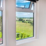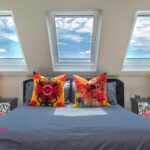 Three Velux windows at the rear and two side windows, framing lush countryside views and creating an airy ambiance, all under a stunning vaulted ceiling.