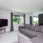As you transition into the living room, a change in flooring to plush carpet marks the arrival into this cosy retreat. Here, a dual-aspect log-burning fireplace, elegantly set within a tiled backdrop, serves as a striking centrepiece, radiating warmth and charm to both the family room and adjacent lounge.