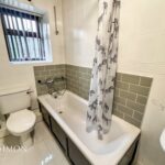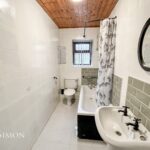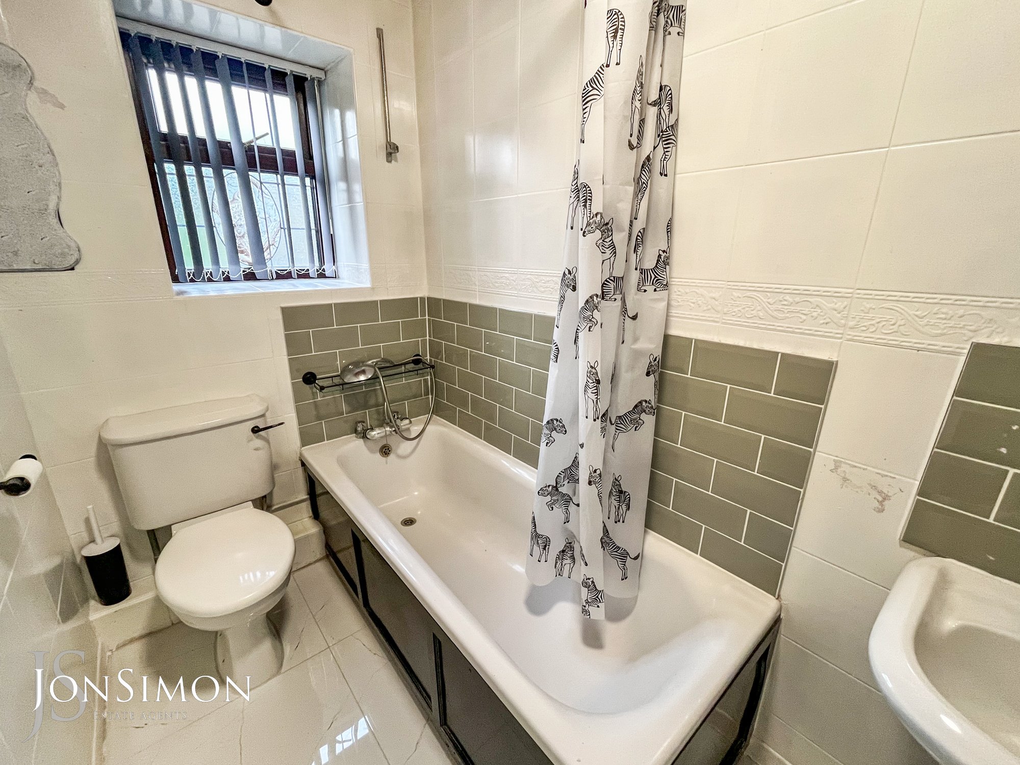 A three-piece white suite comprising of a panel bath with shower above, low level WC, wash hand basin, fully tiled walls, ceiling point and UPVC double glazed rear window.