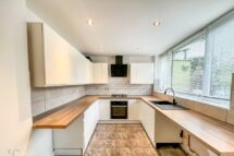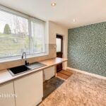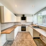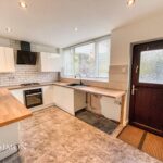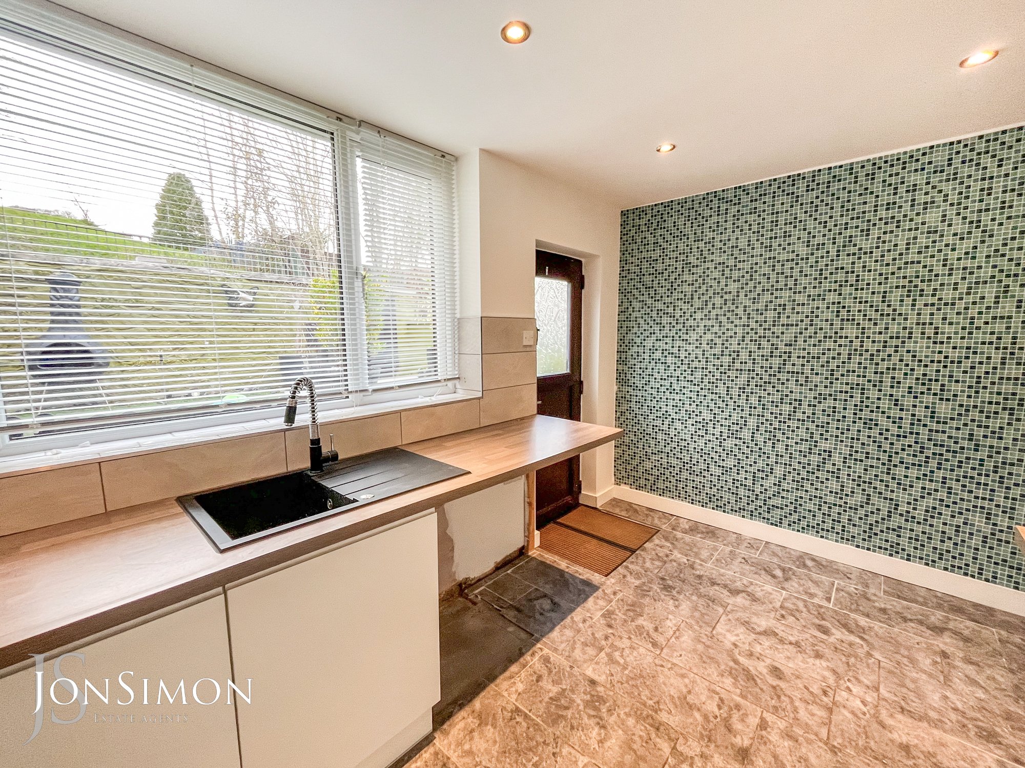 A range of wall and base units with complementary worksurface, single bowl sink unit with drainer, tiled flooring, part tiled walls, plumbed for washing machine and dishwasher, ceiling spotlights double glazed rear window and back door.