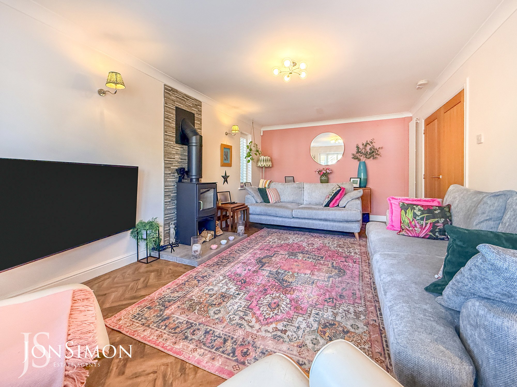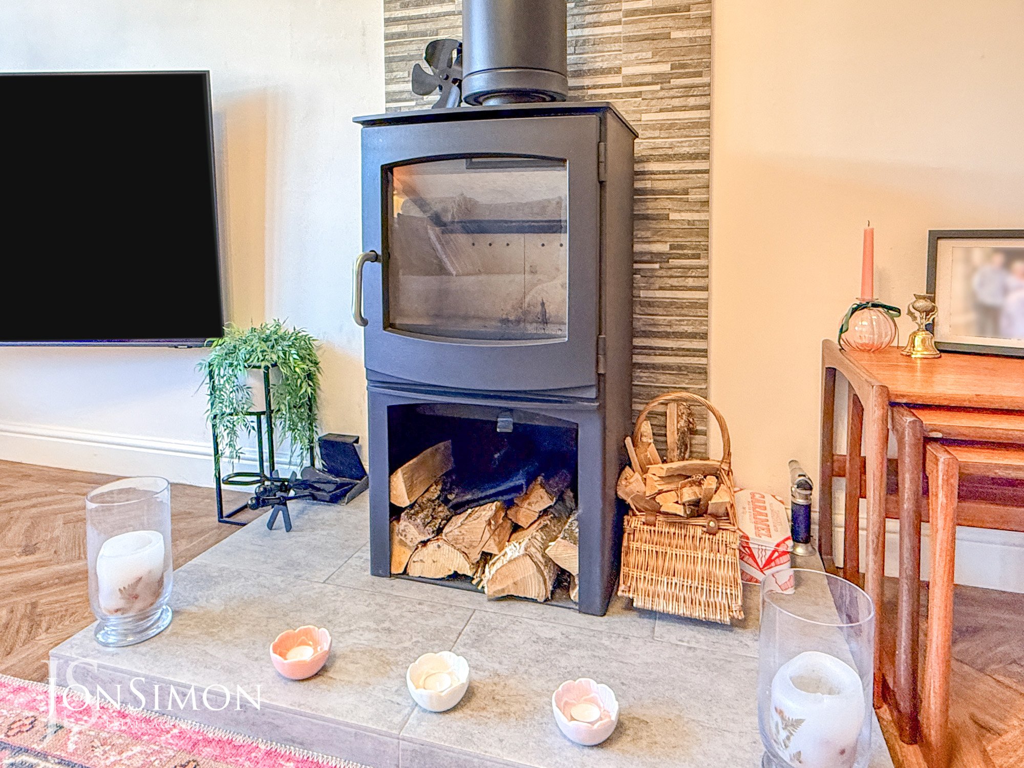 UPVC double glazed bay fronted window, UPVC double glazed side window, feature log burning stove, radiators, TV point, wall lights, ceiling coving and ceiling point.