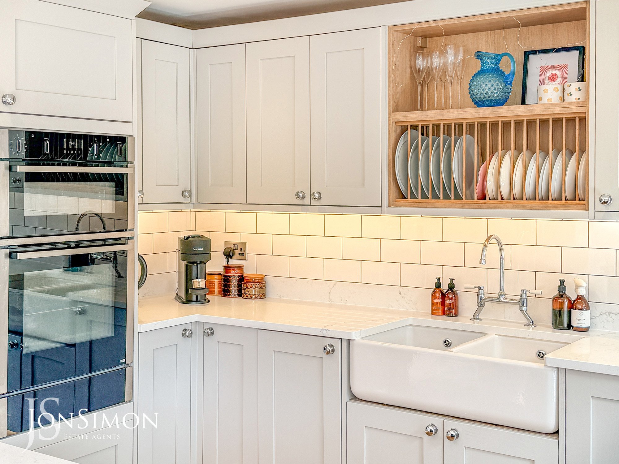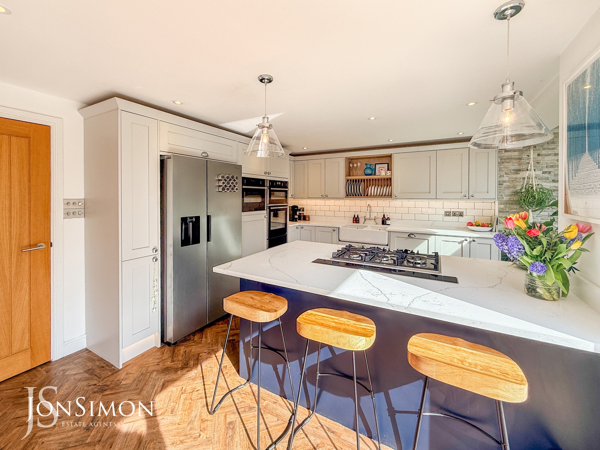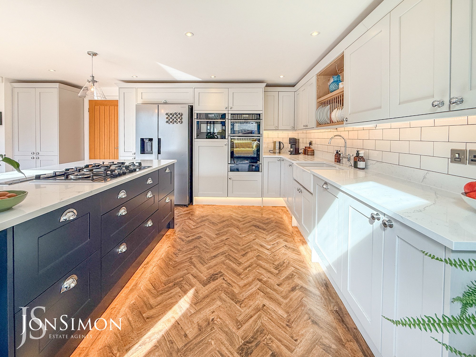 A superb fitted kitchen with a wide range of wall and base units with granite worktops, five ring gas hob with retractable downdraft hood, integrated electric oven, warming drawer, microwave and Combi oven, dishwasher, American style fridge and freezer, breakfast bar, part tiled walls, two bowl sink unit with mixer tap, LED lighting, under the unit lighting, feature lighting, ceiling spotlights, air-conditioning unit, radiators, two Velux windows, UPVC double glazed rear window, two aluminium bi-folding patio doors with built-in blinds, TV point and LVT wood effect flooring.