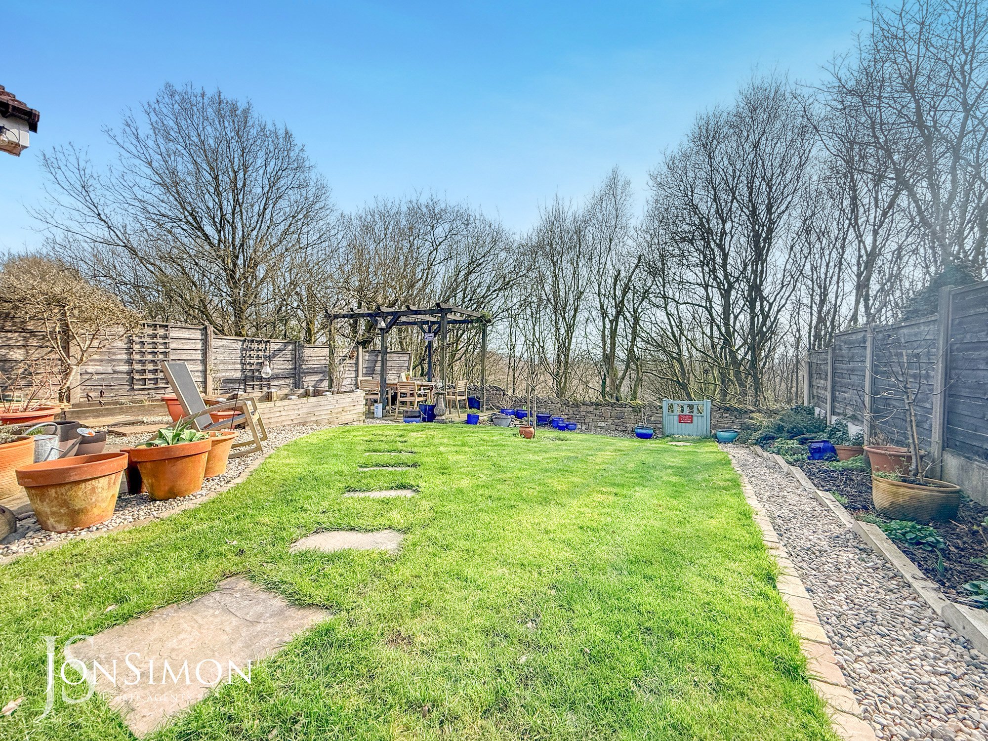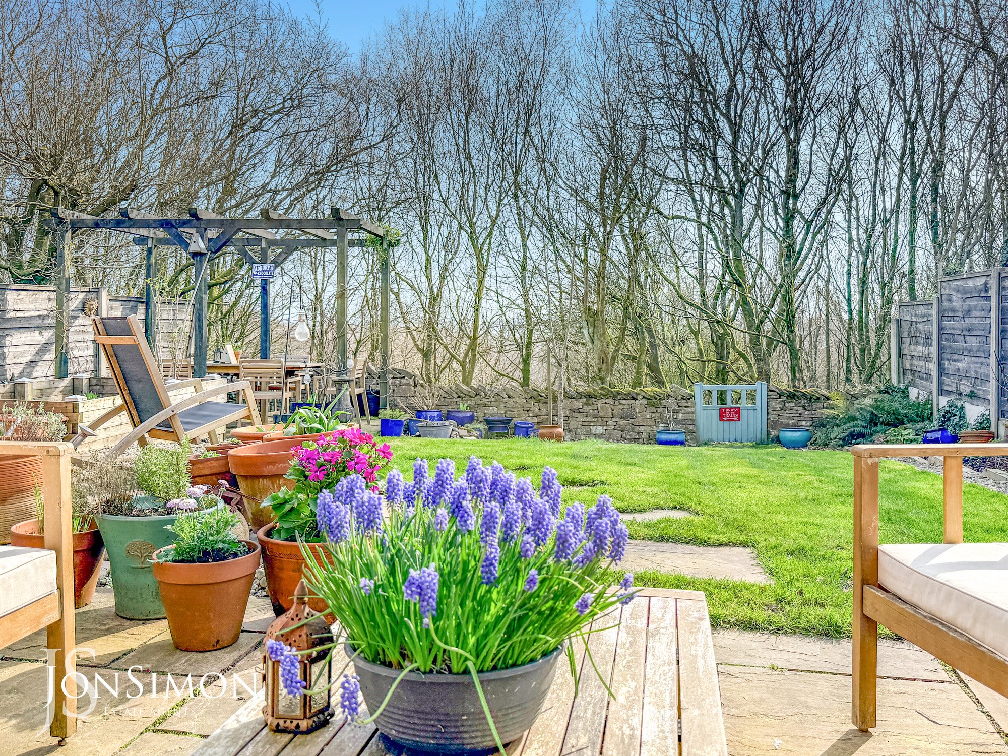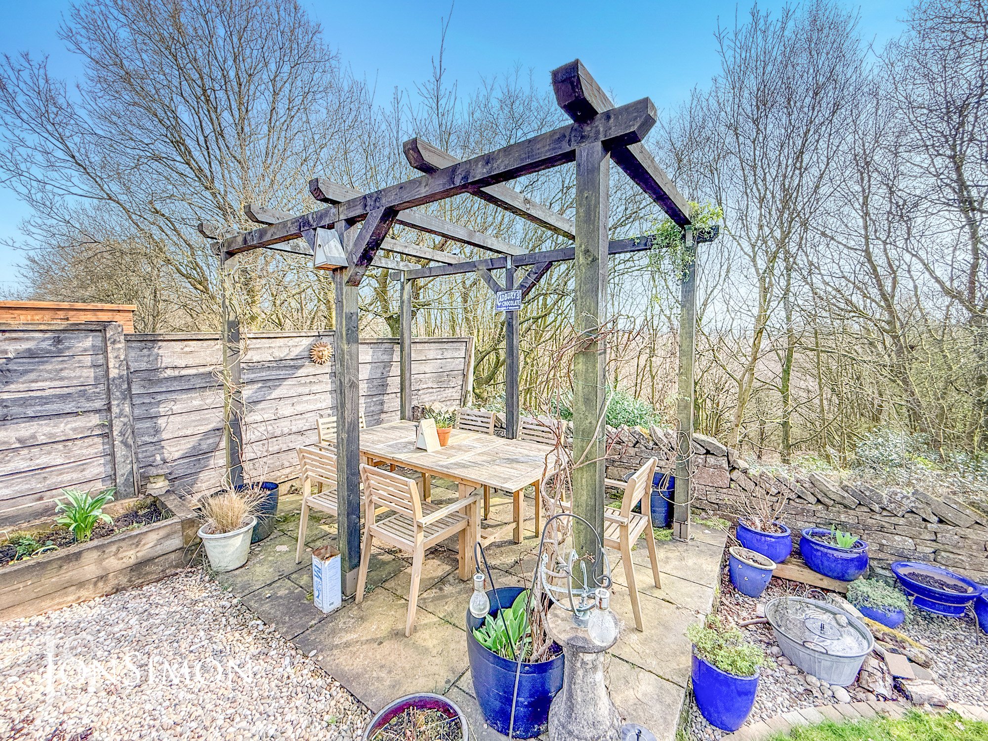 Rear: Large Indian stone paved patio areas, vegetable patch, water feature, lawn area with well maintained borders and shrubs, fruit tree, greenhouse, dry stone wall, fence panel surround, gates access to the rear. Fantastic woodland views. Outside lighting and pergola.