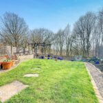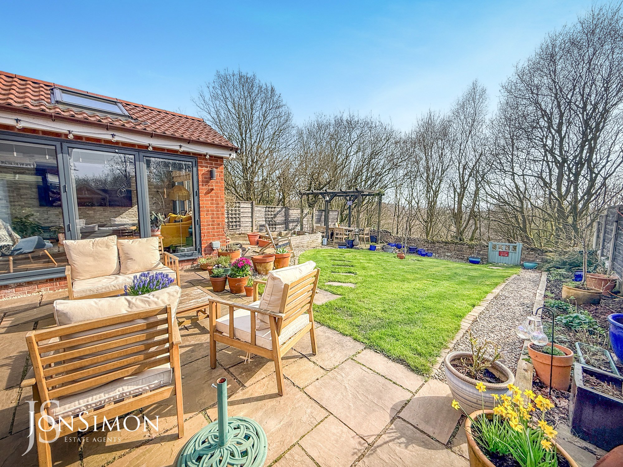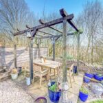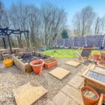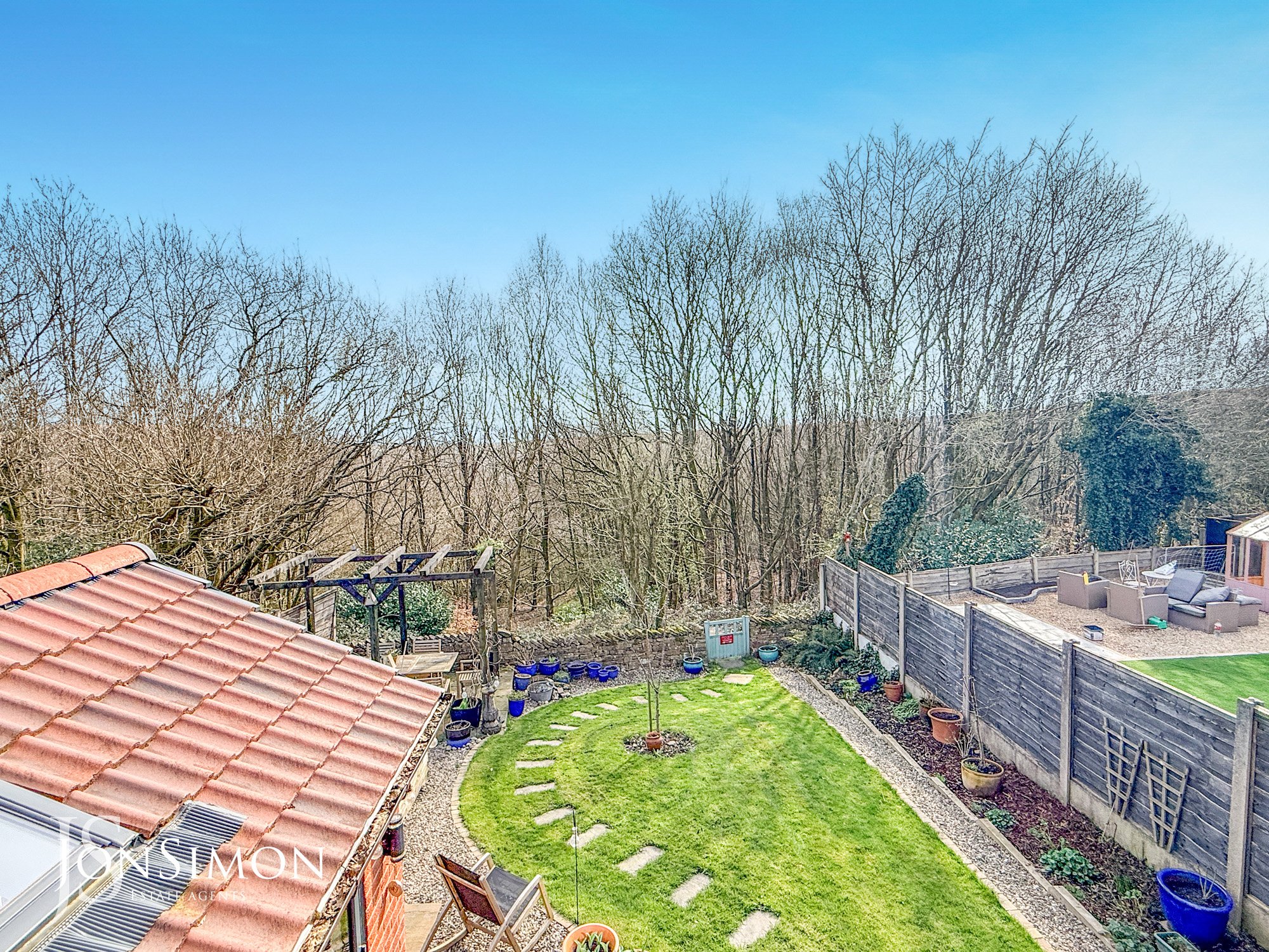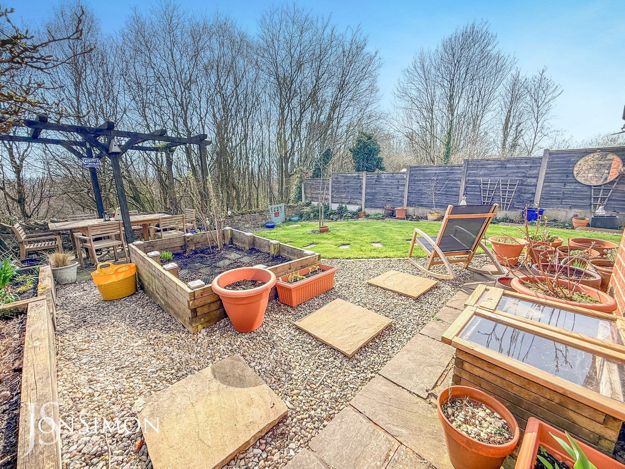 Rear: Large Indian stone paved patio areas, vegetable patch, water feature, lawn area with well maintained borders and shrubs, fruit tree, greenhouse, dry stone wall, fence panel surround, gates access to the rear. Fantastic woodland views. Outside lighting and pergola.