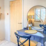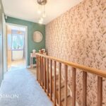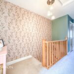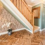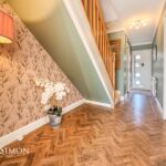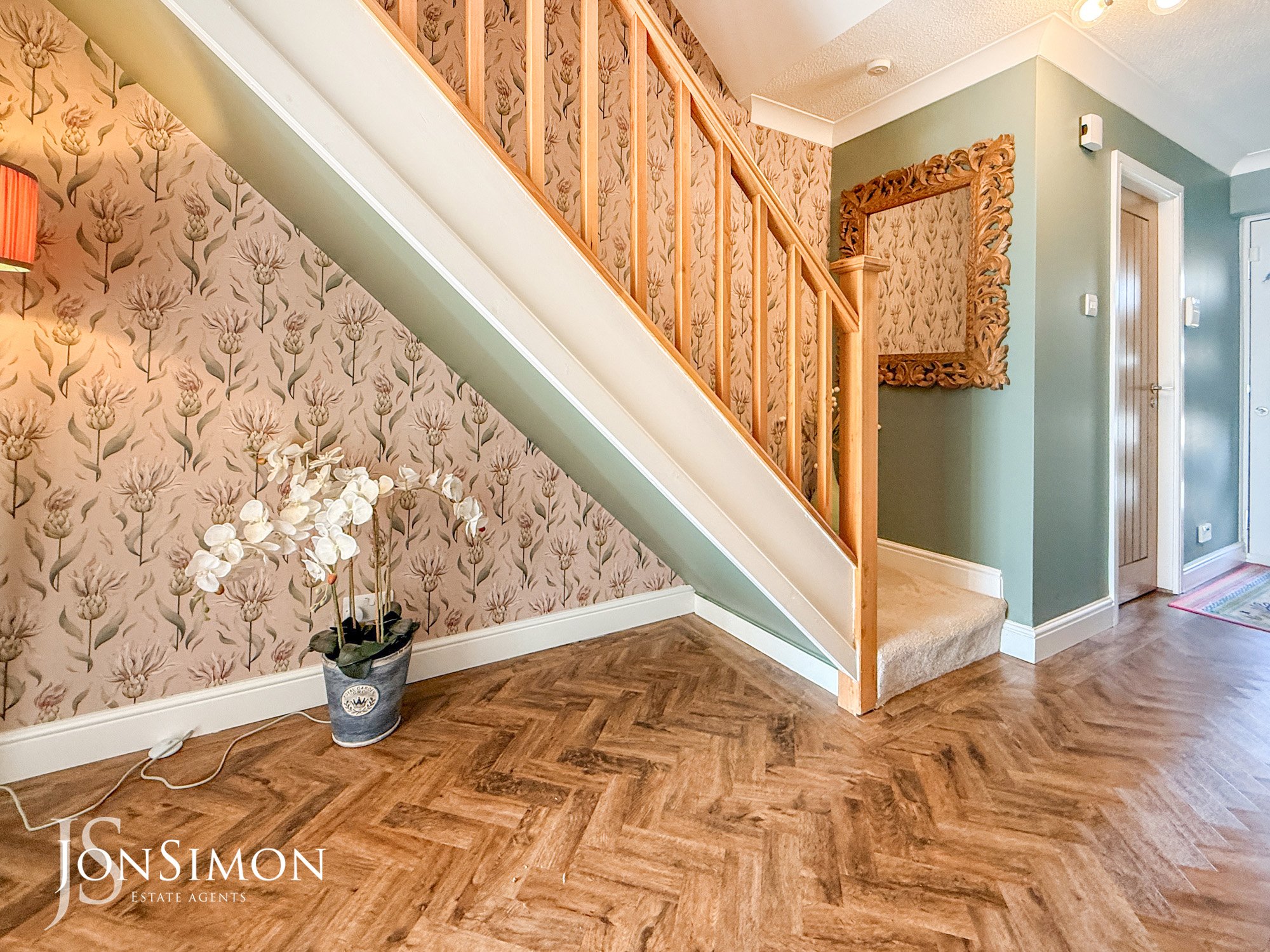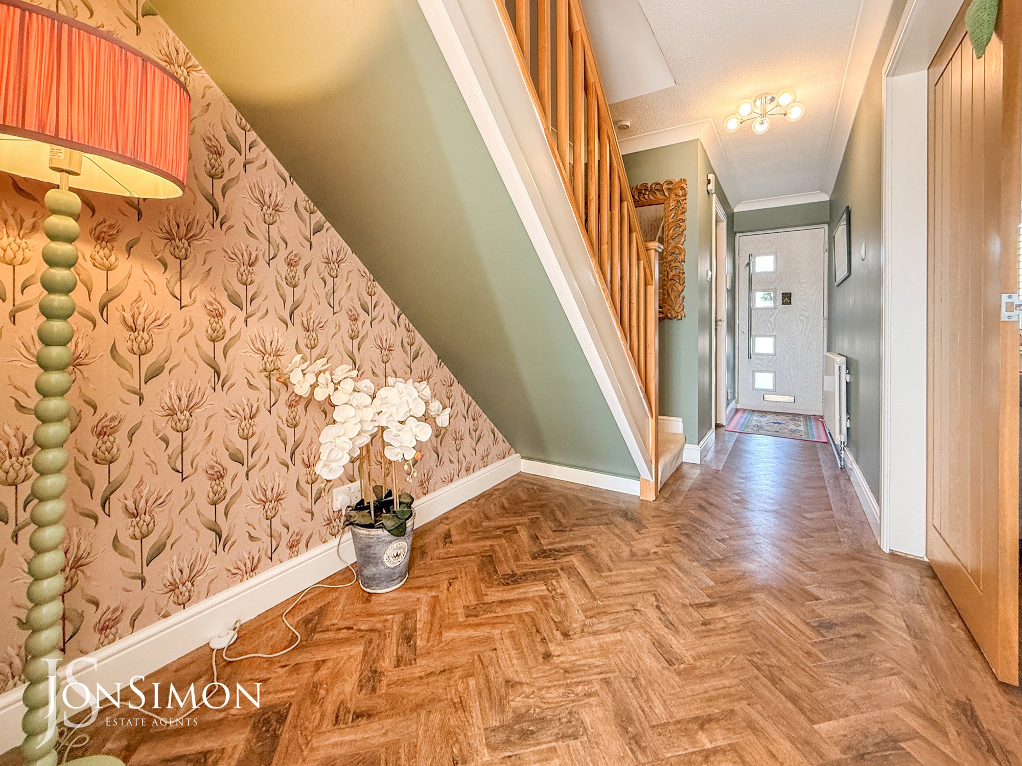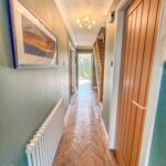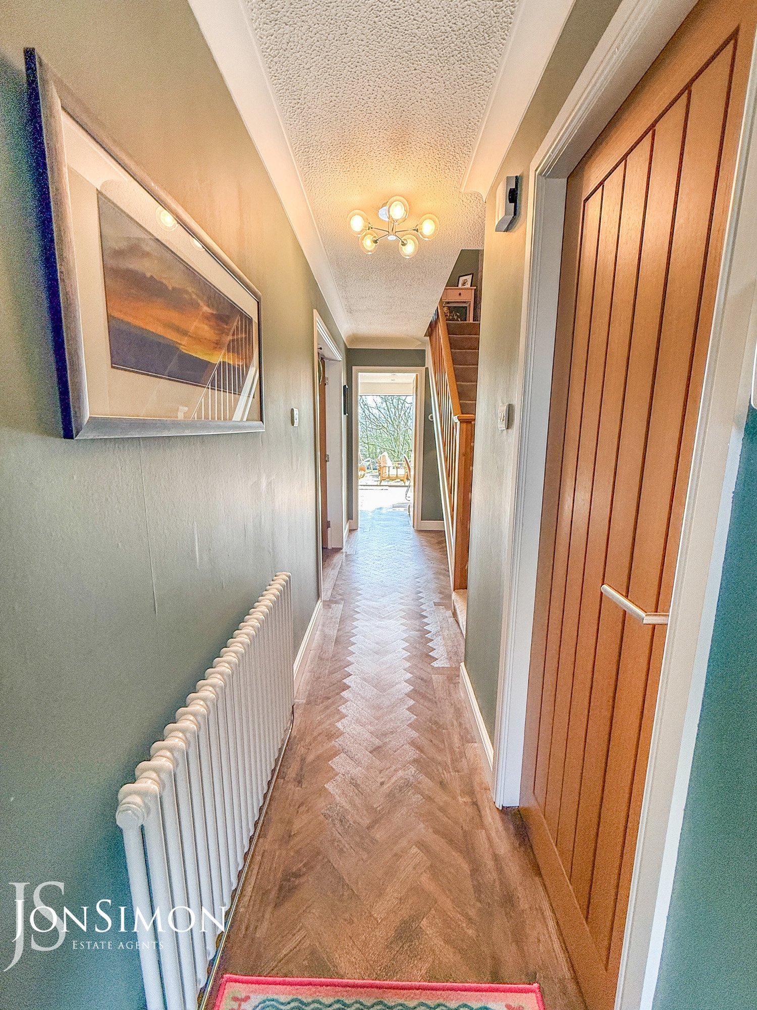 Composite double glazed front radiator, LVT wood effect flooring in hallway and kitchen, ceiling point and stairs leading.