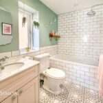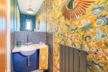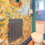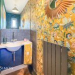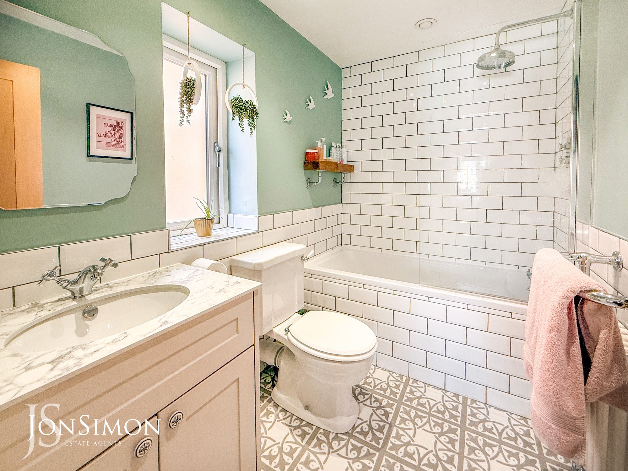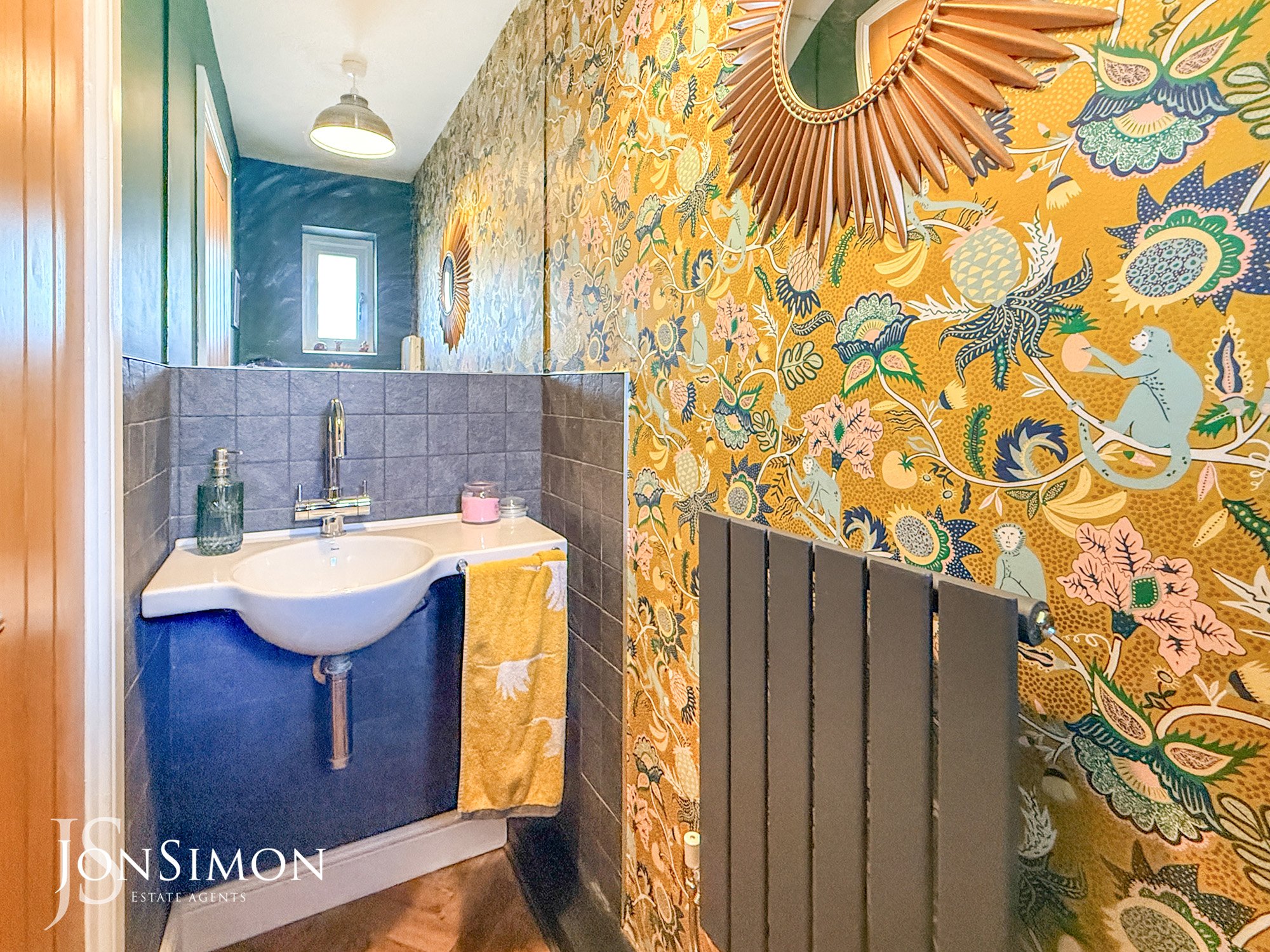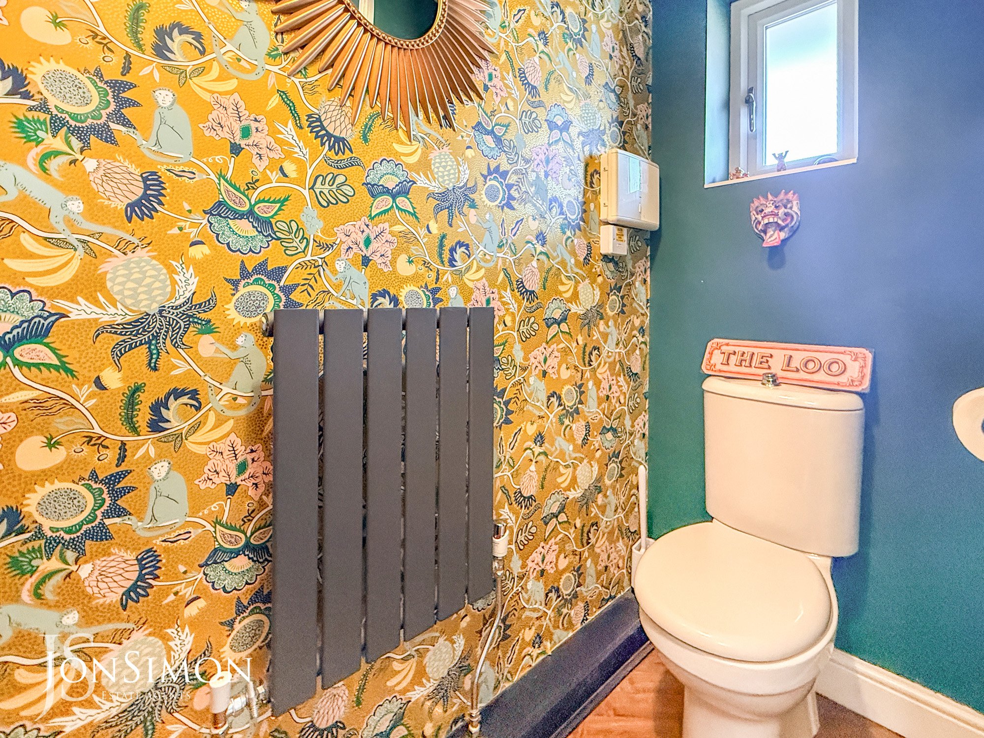 A modern two-piece white suite comprising of a low-level WC, wash hand basin, radiator, part tiled walls, LVT wood effect flooring, wall mounted mirror, ceiling point and UPVC double glazed front window.