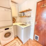 A modern range of wall and base units with complimentary granite worksurface, single bowl sink unit with mixer tap, plumbed for washing machine and dryer, part tiled walls, ceiling spotlights and access to the garage.