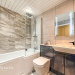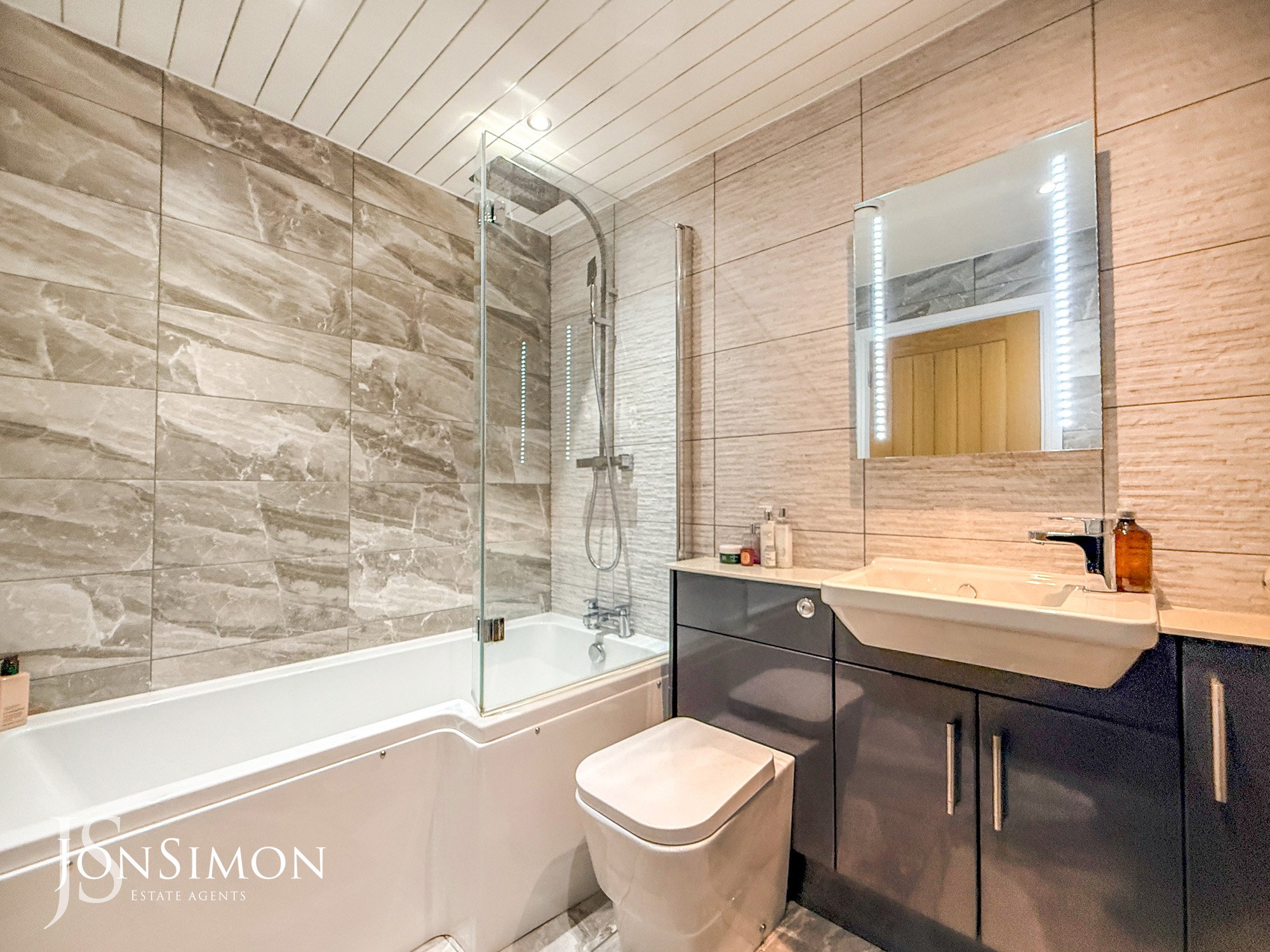 A modern three-piece white bathroom suite comprising of a P-shaped bath with mixer tap shower head above, glass shower screen, low level WC, wash hand basin, chrome radiator, storage cupboards, fully tiled walls and floor, wall mounted electric mirror, extractor unit and ceilings spotlight.