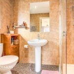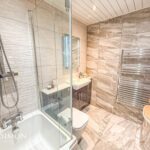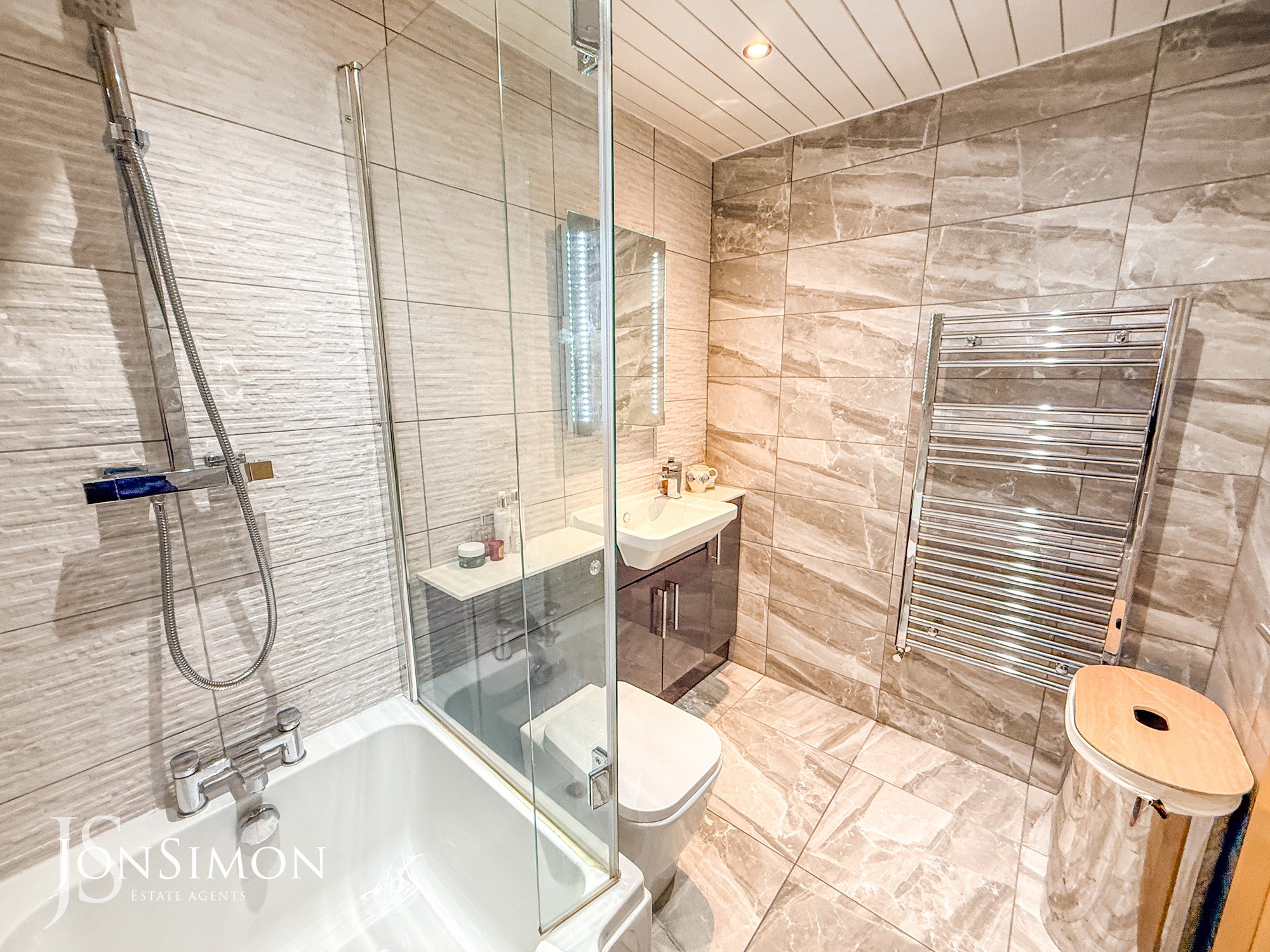 A modern three-piece white suite comprising of a large walk-in shower unit, wash and basin, low-level WC, chrome town radiator, fully tiled walls, extractor unit, ceiling spotlights and UPVC double glazed window.