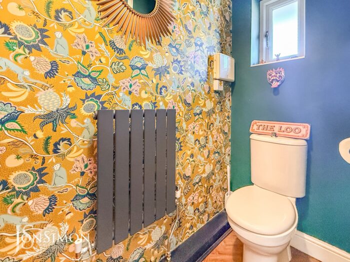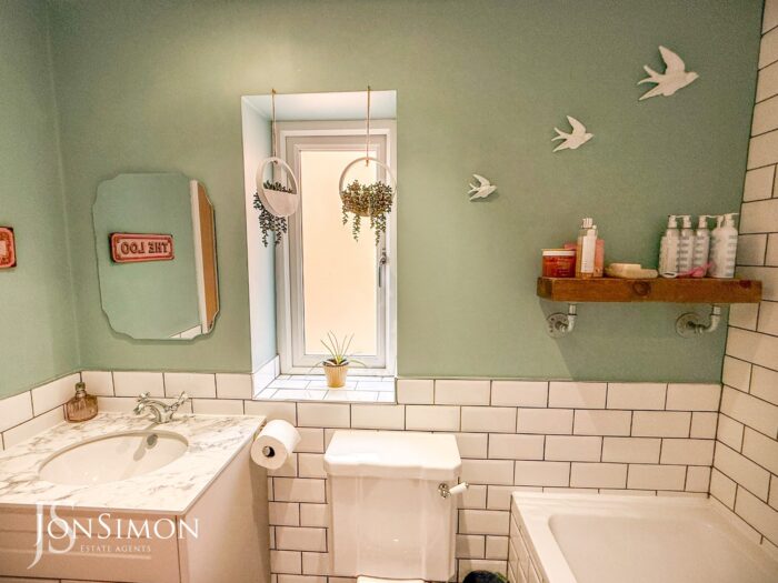A modern two-piece white suite comprising of a low-level WC, wash hand basin, radiator, part tiled walls, LVT wood effect flooring, wall mounted mirror, ceiling point and UPVC double glazed front window.
