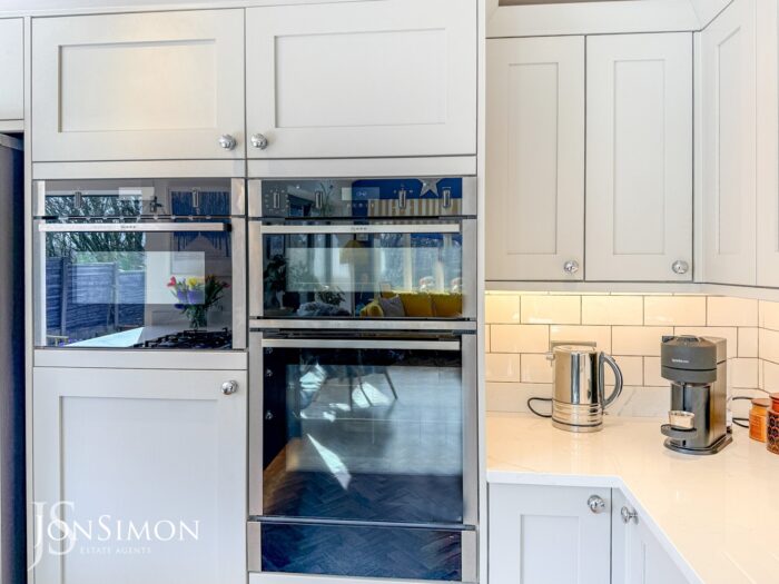 A superb fitted kitchen with a wide range of wall and base units with granite worktops, five ring gas hob with retractable downdraft hood, integrated electric oven, warming drawer, microwave and Combi oven, dishwasher, American style fridge and freezer, breakfast bar, part tiled walls, two bowl sink unit with mixer tap, LED lighting, under the unit lighting, feature lighting, ceiling spotlights, air-conditioning unit, radiators, two Velux windows, UPVC double glazed rear window, two aluminium bi-folding patio doors with built-in blinds, TV point and LVT wood effect flooring.
