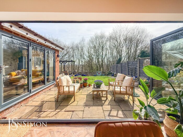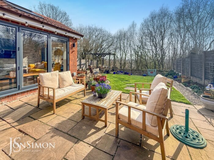 Rear: Large Indian stone paved patio areas, vegetable patch, water feature, lawn area with well maintained borders and shrubs, fruit tree, greenhouse, dry stone wall, fence panel surround, gates access to the rear. Fantastic woodland views. Outside lighting and pergola.
