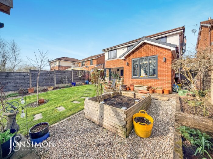 Front: Block paved driveway, well maintained lawn area with borders and shrubs.