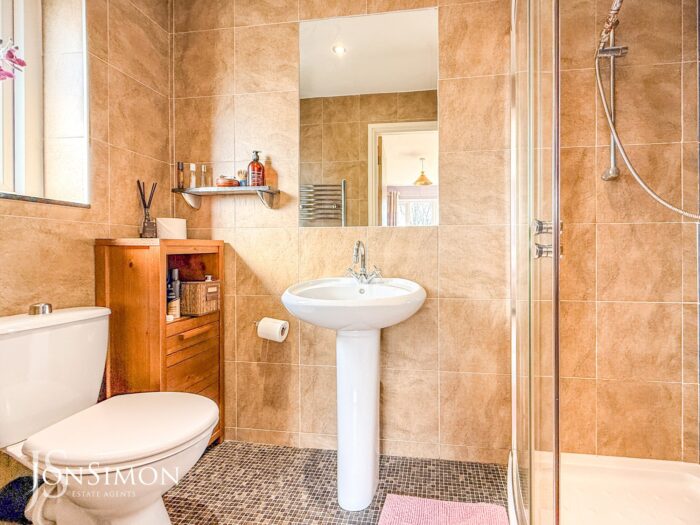 A modern three-piece white suite comprising of a large walk-in shower unit, wash and basin, low-level WC, chrome town radiator, fully tiled walls, extractor unit, ceiling spotlights and UPVC double glazed window.