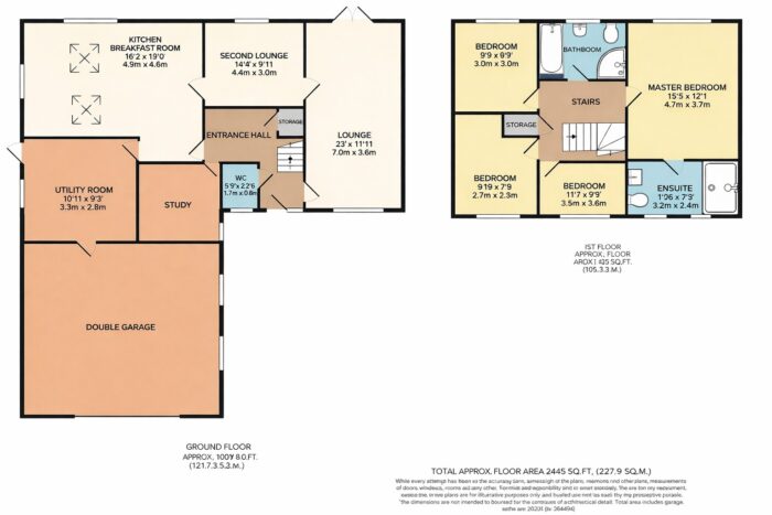 The large en-suite comprises of a modern three piece white suite with double shower area, pedestal wash hand basin and low level wc. Tiled walls and tiled flooring and two double glazed windows.