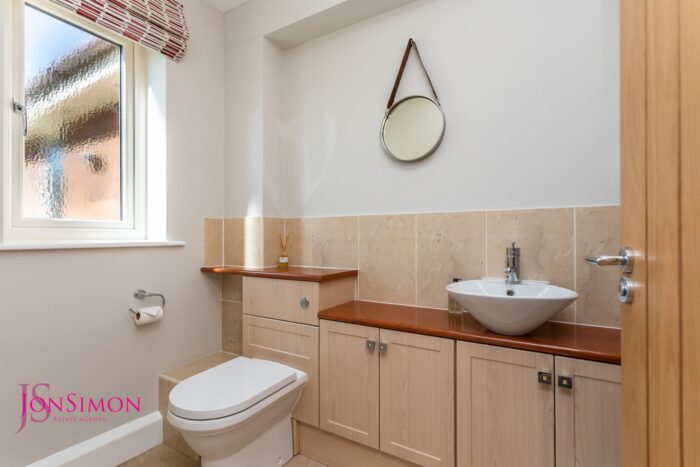 The modern guest wc/cloaks comprises: low level wc and vanity wash hand basin.