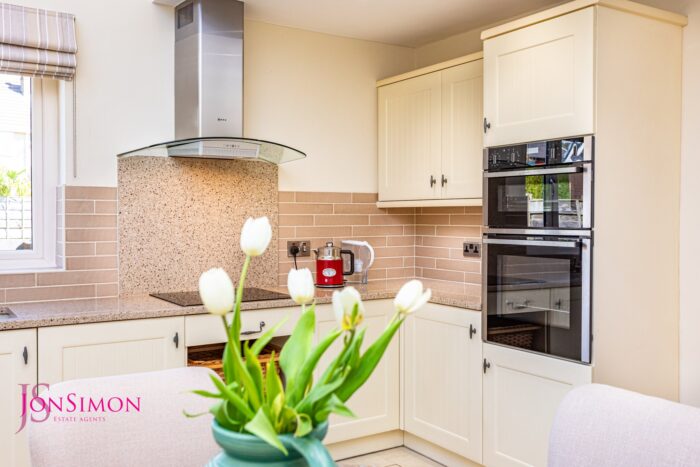 Stunning range of contemporary wall and base units, ‘Neff’ appliances to include built in electric double oven, four ring induction hob, integrated dishwasher, freezer and fridge, two double glazed Velux windows and two double glazed windows providing plenty of natural light. Partially tiled walls, ‘Karndean’ flooring, underfloor heating, inset ceiling spotlighting and a double radiator.