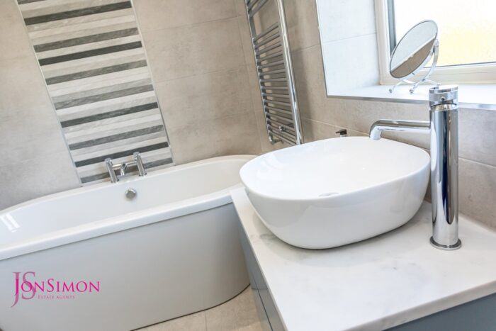The family bathroom has a stunning four piece white suite comprising bath, pedestal wash hand basin, low level wc, tiled
