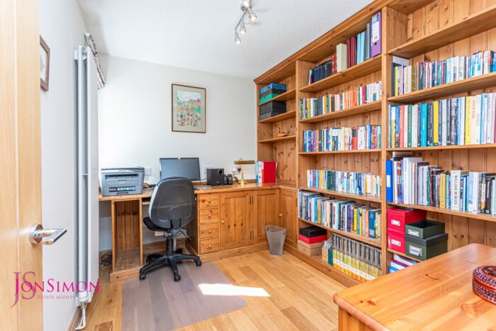 The study is fully fitted with built in pine desk and book shelving and double glazed front window.