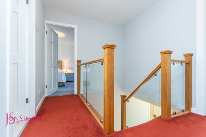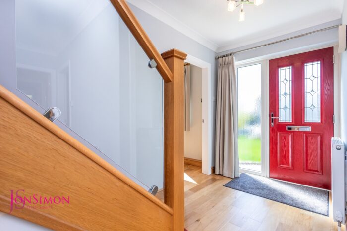Beautifully presented light and airy entrance hallway with feature oak staircase, glass balustrade to first floor, large under stairs