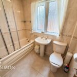 A three-piece bathroom suite comprising of a panelled bath with mixer taps, electric shower above, low level WC, wash hand basin, radiator, fully tiled walls and flooring, ceiling point and UPVC double side window.