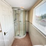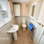 A three-piece white suite comprising of a walk-in shower unit, low WC, wash hand basin, chrome towel radiator, part tiled walls, Boiler, extractor unit, ceiling spotlights and UPVC double rear window.