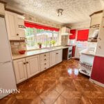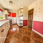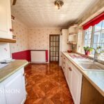 Range of wall and base units with complementary worksurface, one and a half bowl sink unit with drainer, electric cooker with four ring electric hob, extractor unit above, part tiled walls, fully tiled flooring, radiator, plumbed for washing machine, ceiling coving and UPVC double glazed door and windows.