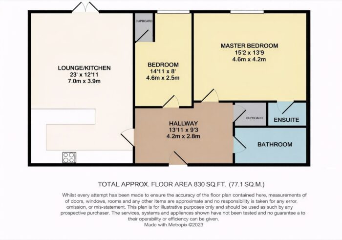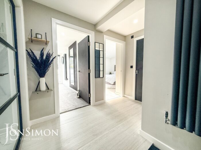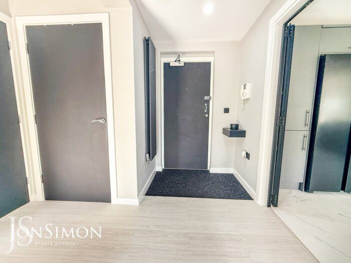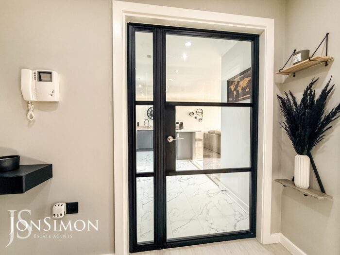 Intercom system, radiator, large storage cupboard plumbed for washing machine and ceiling spotlights. Black aluminium feature door and window.